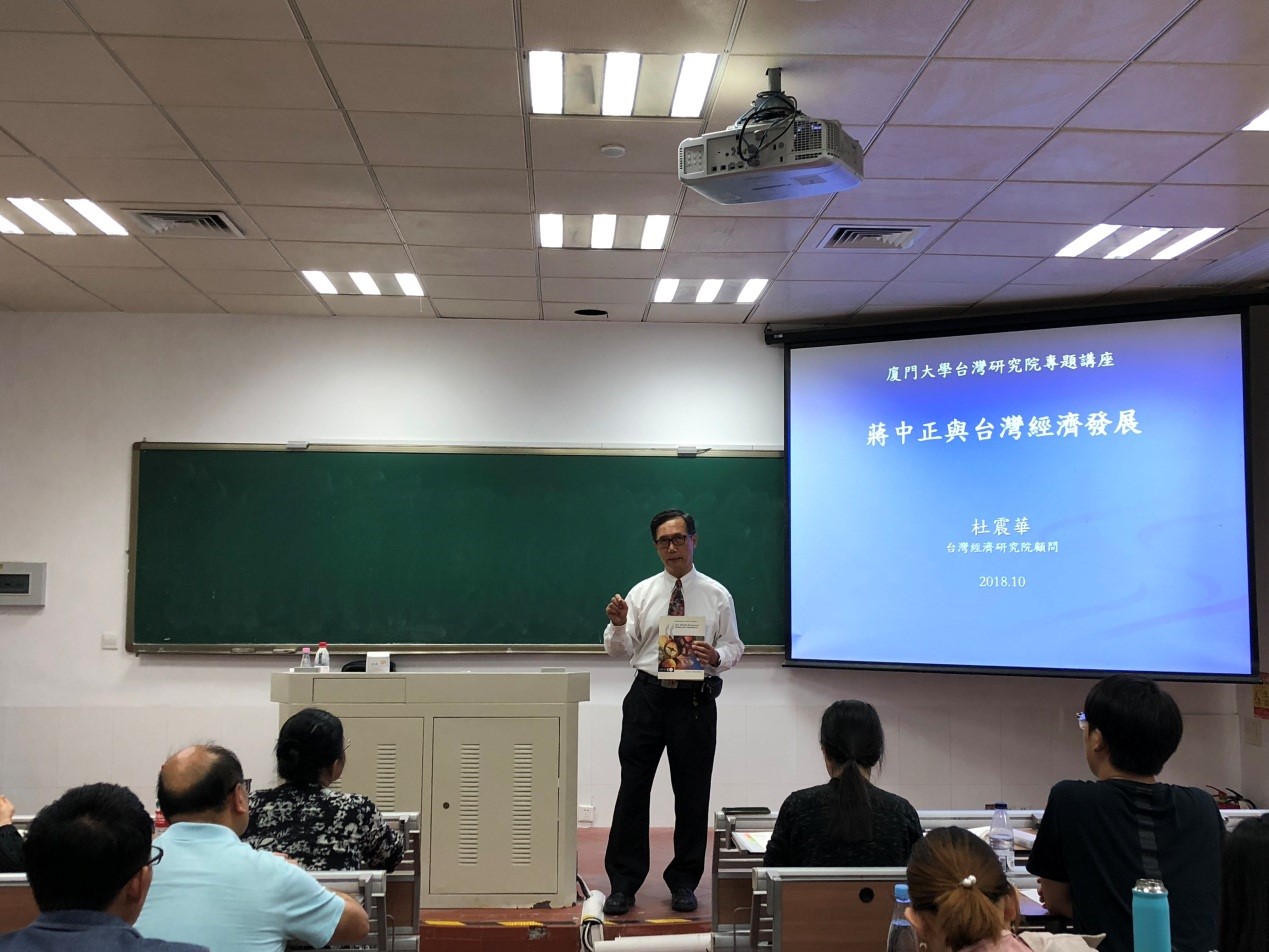 10月18日下午,台湾大学“国家发展研究所”副教授,中华文化大学全球商务学科副教授,商业发展研究院兼职顾问,台湾经济研究院兼职顾问,中国时报、经济日报、世界日报兼职社论主笔杜震华教授来访我院,关于“蒋中正与台湾经济发展”的话题在厦门大学集美二103多媒体教室开展主题讲座。我院经济所邓利娟教授主持,王华教授、石正方副教授及部分硕博士同学到场聆听本次讲座。