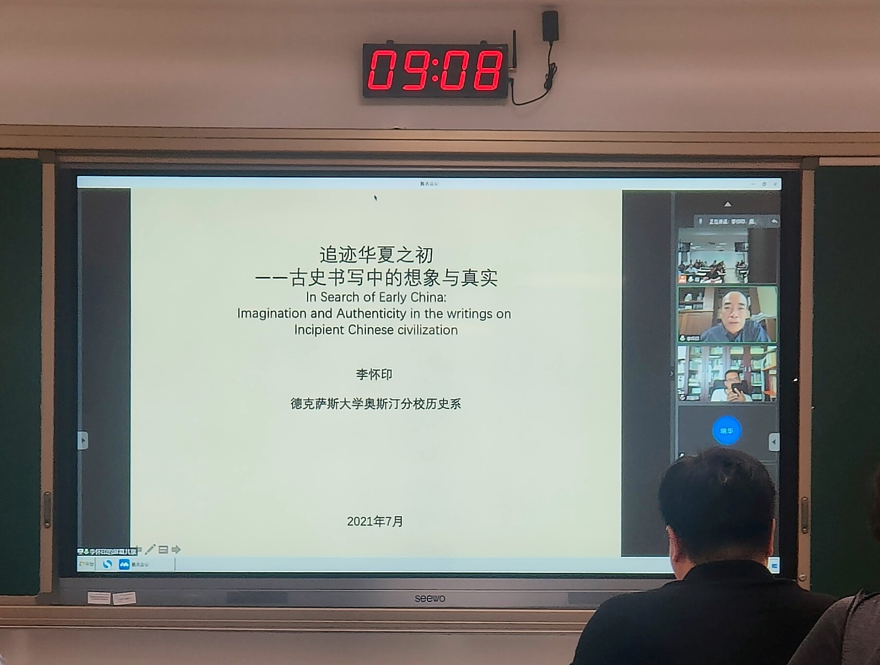 7月14日上午9点,德克萨斯大学奥斯汀分校历史系教授李怀印为我院师生做“追迹华夏之初——古史书写中的想象与真实”主题讲座。此次讲座采用网络视频会议的形式,连线正在美国的李怀印教授。我院师生在嘉庚四306统一参加视频会议。讲座由我院历史所所长陈忠纯教授主持,人文学院历史系主任张侃教授担任与谈人。我院历史所副所长黄俊凌副教授、王玉国助理教授、王琪颖助理教授、两岸所张彩霞助理教授,人文学院历史系吴海兰副教授以及我院各所硕博生及历史系部分同学到场参加讲座。