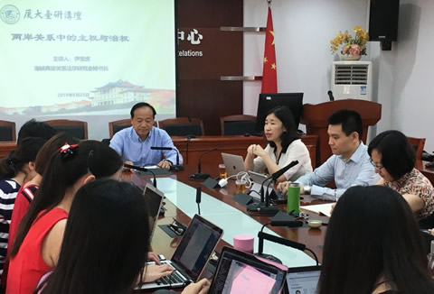 2019年5月25日,“台研法治讲堂”第6季第9期在台湾研究院五楼学术报告厅举行,中国法学会中国法学学术交流中心主任、海峡两岸关系法学研究会秘书长、两岸关系和平发展协同创新中心兼职专家尹宝虎莅临厦门大学,应邀主讲《两岸关系中的主权与治权》。讲座由台湾研究院副院长彭莉教授主持,法律研究所薛永慧副教授、副所长刘文戈老师等师生聆听了讲座。