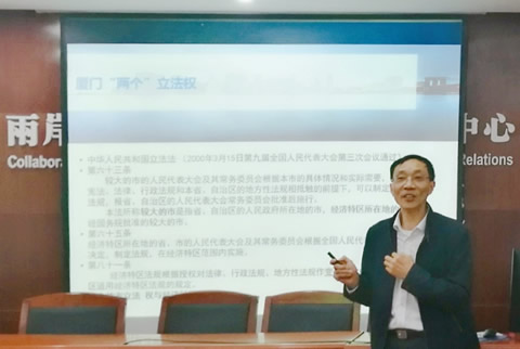 2018年12月27日,“台研法治讲堂”第6季第5期在台湾研究院五楼学术报告厅举行,厦门市法制局党组书记、局长丁贤志应邀主讲《地方涉台立法实务——厦门的实践》,讲座持续三个学时。本期讲座由台湾研究院副院长彭莉教授主持,我校师生数十人聆听了丁贤志的讲座。