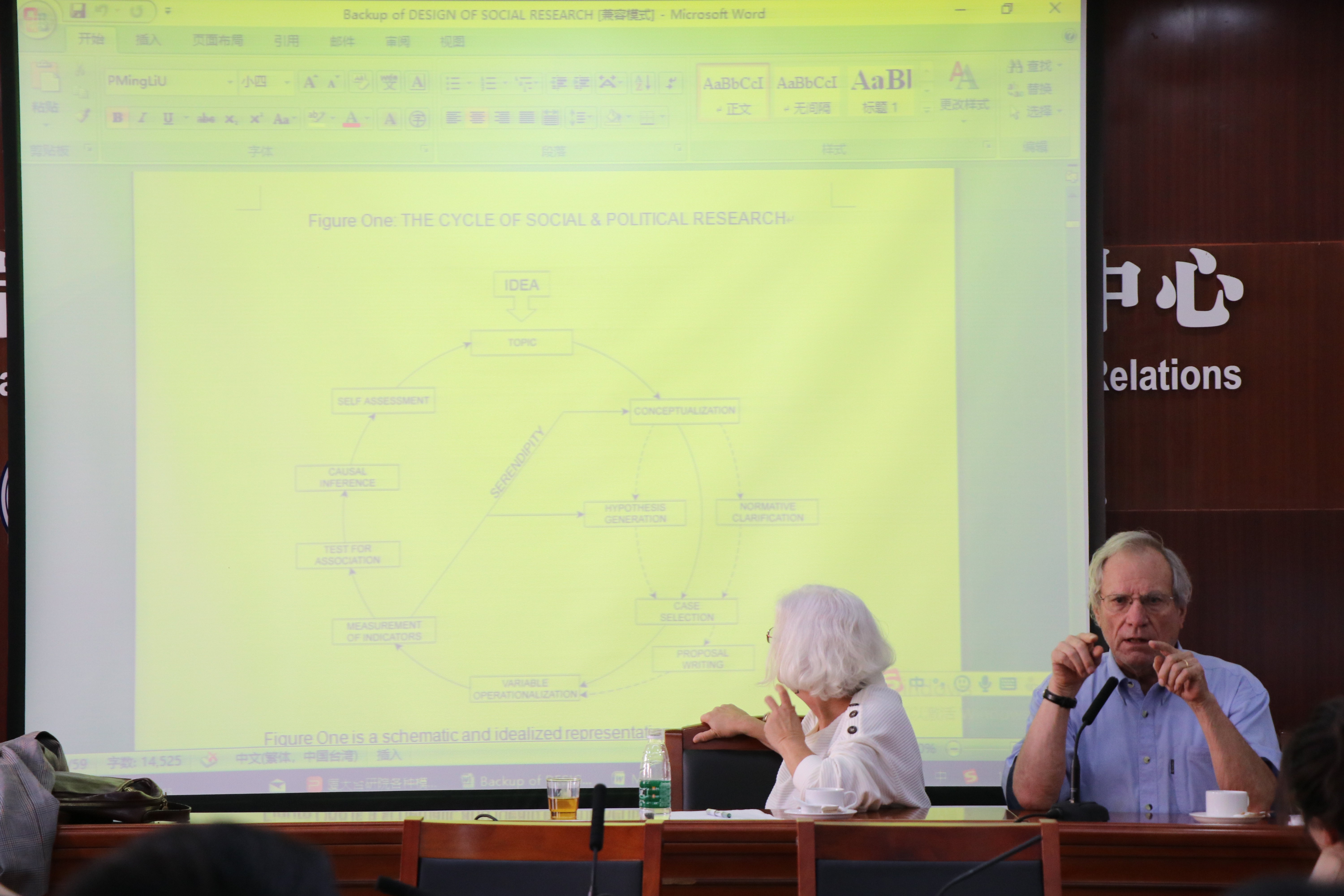 在讲座伊始,施密特教授和卡尔教授就自己的研究领域做简单介绍。施密特教授在比较政治学领域做出巨大的贡献,卡尔教授更关注美国政治。两位教授以“right idea”为起点,首先施密特先生指出一个好的想法来自于现实生活中的好的问题和真实的问题,然后我们就要对这个想法的重要性进行充分的论证;其次卡尔教授补充道进行研究的基础是建立在我们大量查询所有相关文献之上的,在进行文献阅读中我们还要厘清文献当中的相关概念和规范,从中组织好文章构架,寻找到一个自己感兴趣和有意义的切入点也就是案例,对其做一个案例研究。卡尔教授为了便于我们理解还举了相关例子进行分析。之后施密特教授指出当我们进行研究假设时要找到充分的证据对其进行证明,研究过程中对于我们提出的假设能否成立,除了收集证据外还要考虑时间和历史因素;最后他们也对定性比较分析QCA等方法也进行了相关介绍。讲座中,施密特教授和卡尔教授以风趣幽默的语言,引用详实的例子,大大“增加了讲座的理解性和吸引力。