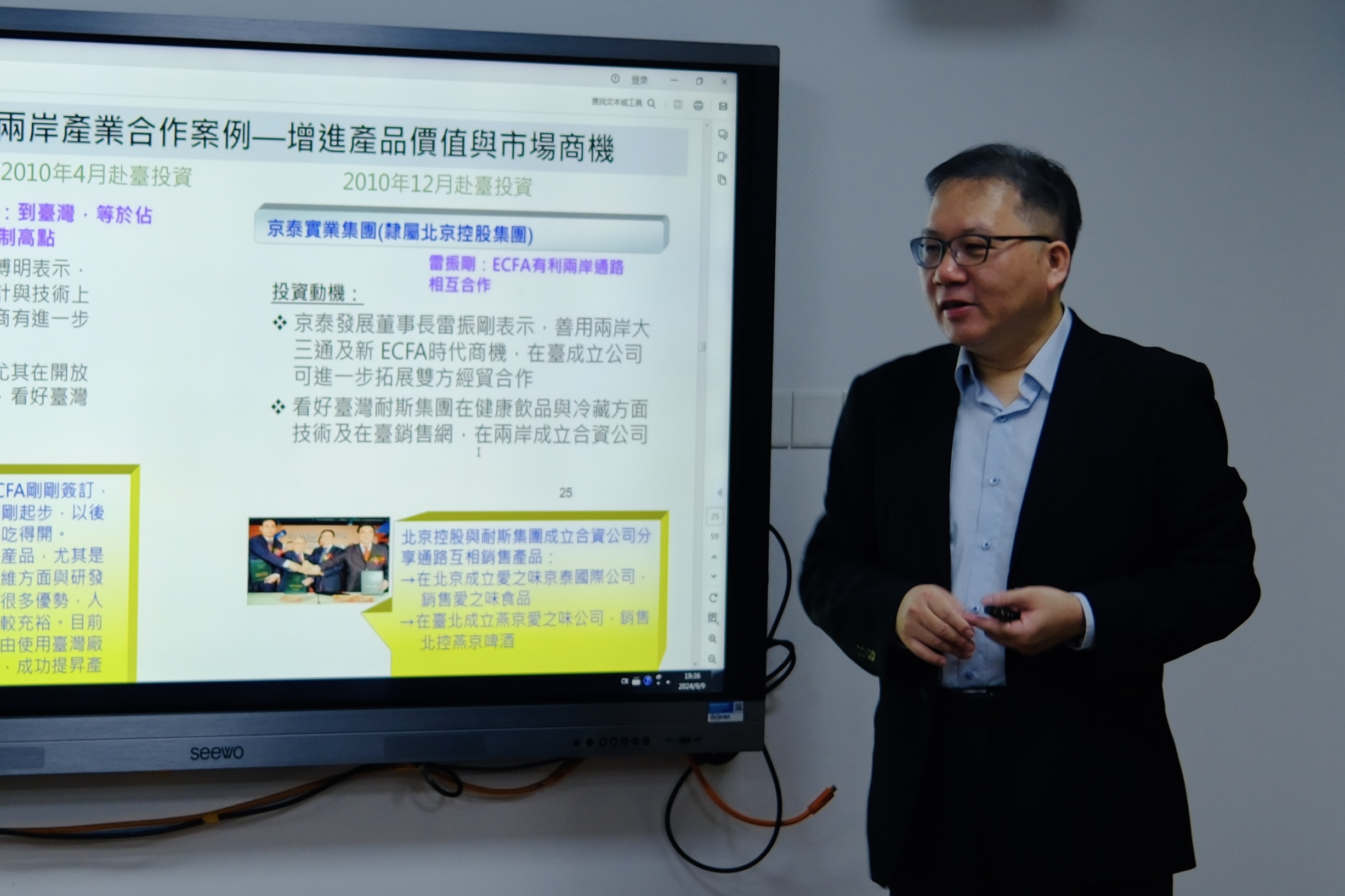 在讲座中,黄处长对两岸经贸的发展前景做出了研判。黄处长认为,两岸经贸合作目前呈现投资趋缓、贸易依存度下降的总体特征,未来两岸经贸关系的波动性仍将存在。凭借长期的实务工作经验,黄处长在分享了两岸产业合作的多元案例以及调研成果后总结认为,两岸产业合作被政治因素、政策因素与政策执行因素所制约,与此同时台商对大陆投资的“逐利避险”逻辑与“机遇窗口”逻辑之间的推拉张力在不断积聚。