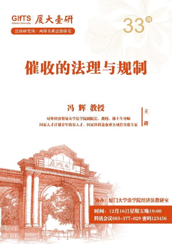 2022年12月16日晚,对外经济贸易大学法学院副院长冯辉教授应邀做客第33期两岸关系法治讲堂,发表题为“催收的法理与规制”的学术演讲。本次讲座由我院法律所承办,法学院经济法教研室协办,我院副院长季烨教授主持讲座。