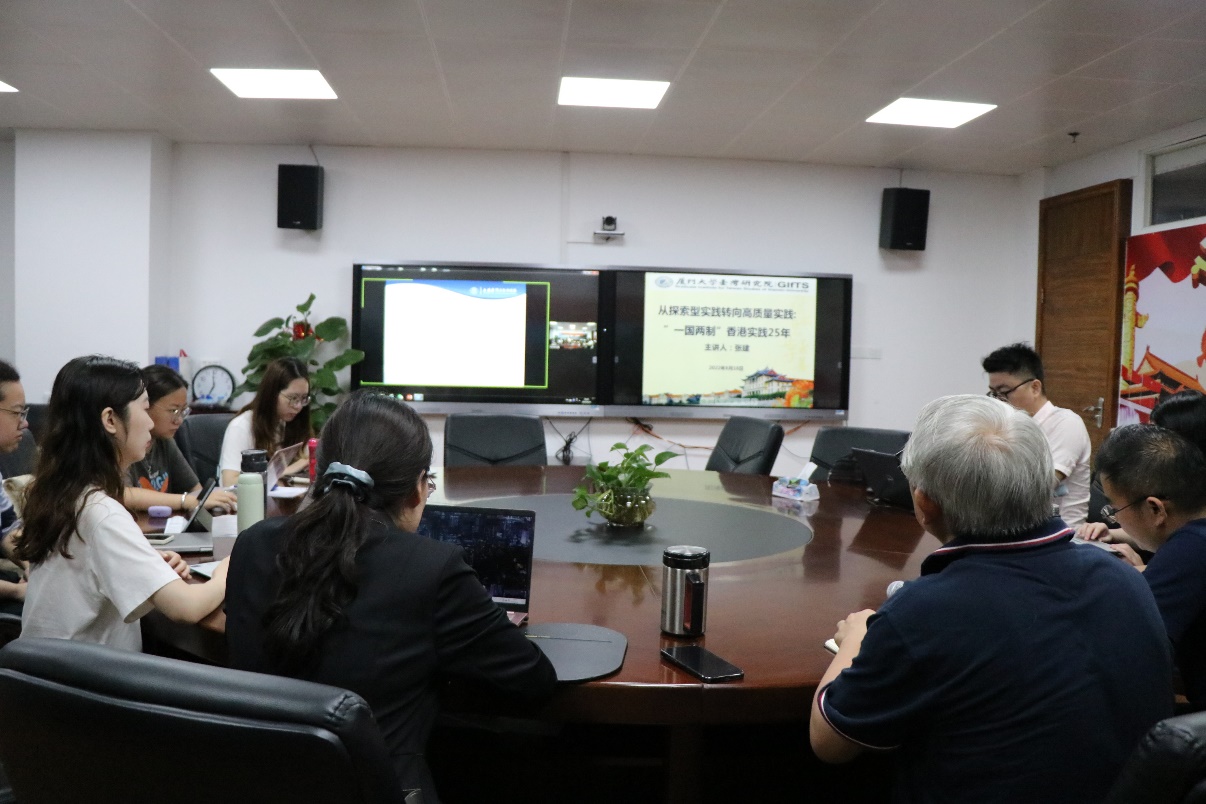 6月16日晚,厦门大学港澳台研究中心邀请上海国际问题研究院台港澳所港澳研究室主任张建副研究员,在厦大嘉庚四418会议室举行题为“从探索型实践转向高质量实践:‘一国两制’香港实践25年”的学术讲座。本场讲座由厦门大学港澳台研究中心副主任、台湾研究院政治所副所长王贞威主持,政治所所长陈先才教授出席,台湾研究院硕博生共计四十余人通过线上线下方式参加。