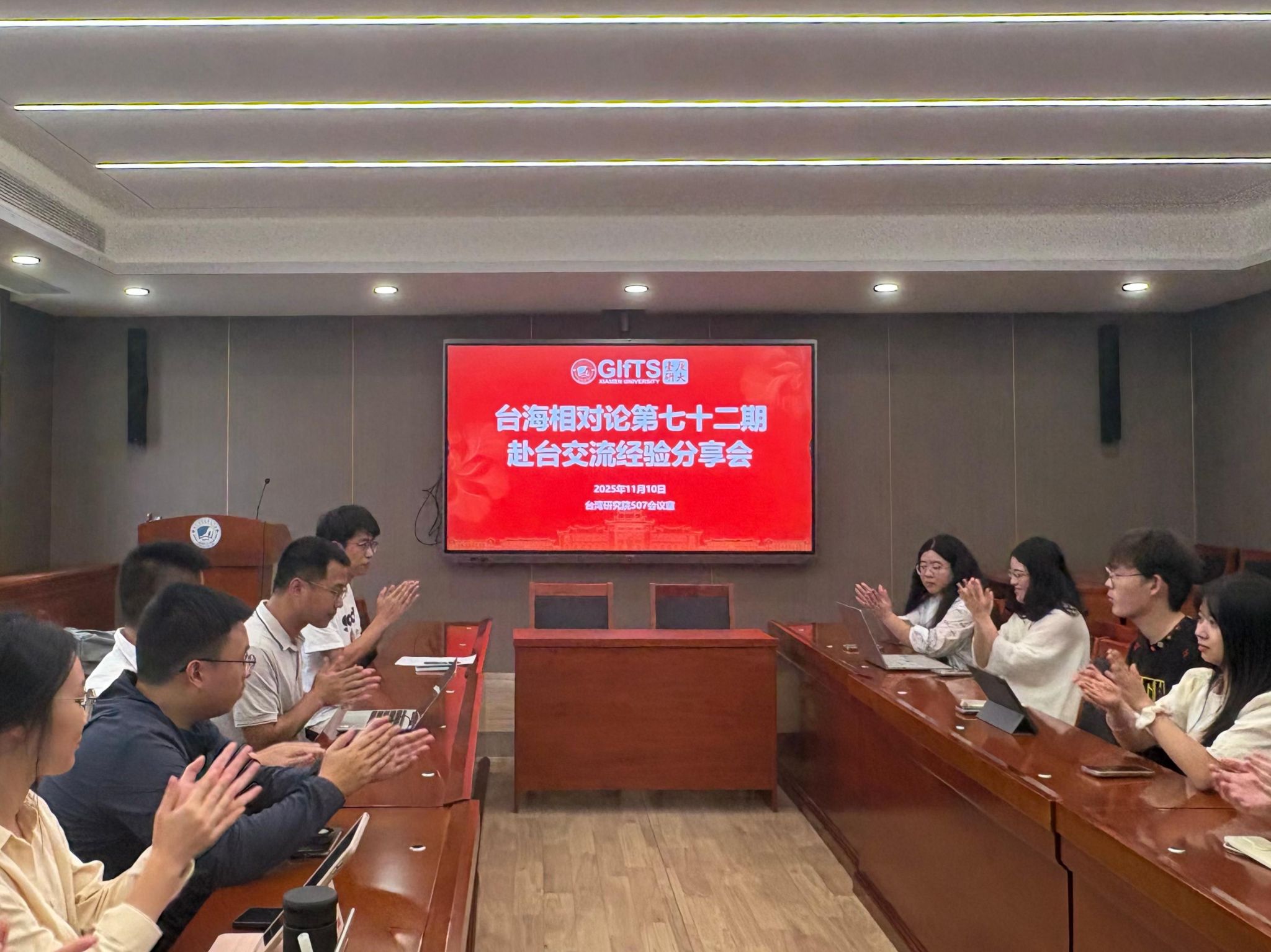 为帮助学生全面了解赴台交流的学术环境与日常生活,11月10日下午,第七十二期台海相对论——“赴台经验交流分享会”在台湾研究院507学术报告厅举行。本次活动邀请了五位曾赴台湾师范大学、高雄中山大学等高校交流的学生代表,围绕学术研究、生活体验、文化观察等多个方面,分享了在台交流期间的亲身体验,为有意赴台交流的学生提供了多角度参考。