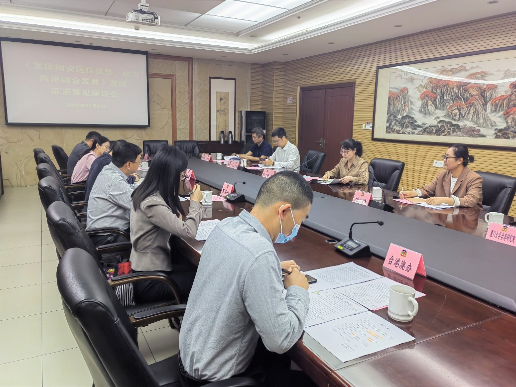 会议伊始,唐桦副教授从翔台经贸融合、翔安台胞的社会融入及社会参与、翔台文化融合等方面详细汇报了课题组研究成果,与会人员高度肯定了课题组的专业性。此后,各部门负责人结合自身部门的实操经验,针对两岸产业对接合作、台胞公共服务的供给、两岸文化融合等方面提出了宝贵的建议。
