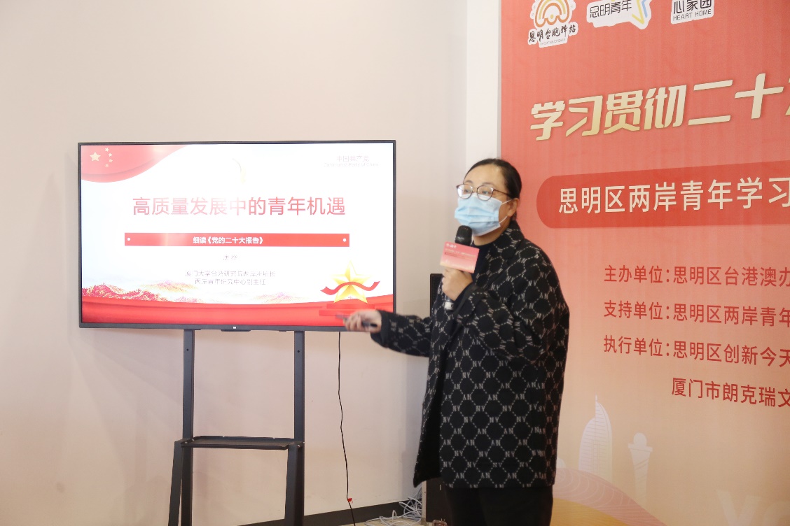 2022年12月19日,为推动两岸青年共同学习贯彻党的二十大精神,由厦门市思明区台港澳办、共青团思明区委员会、思明区委人才办共同主办的“学习贯彻二十大·踔厉奋发新征程”在两岸青年心家园举办,我院两岸所所长、两岸青年研究中心副主任唐桦应邀为两岸青年作专题宣讲,两岸青年感触颇深,在座谈会上积极分享了各自心得。