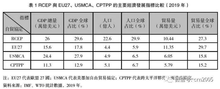 表1:RCEP与EU27、USMCA、CPTPP的主要经济发展指标比较(2019年)注:EU27代表欧盟27国;USMCA代表美墨加自由贸易协定;CPTPP代表跨太平洋伙伴全面进步协定。