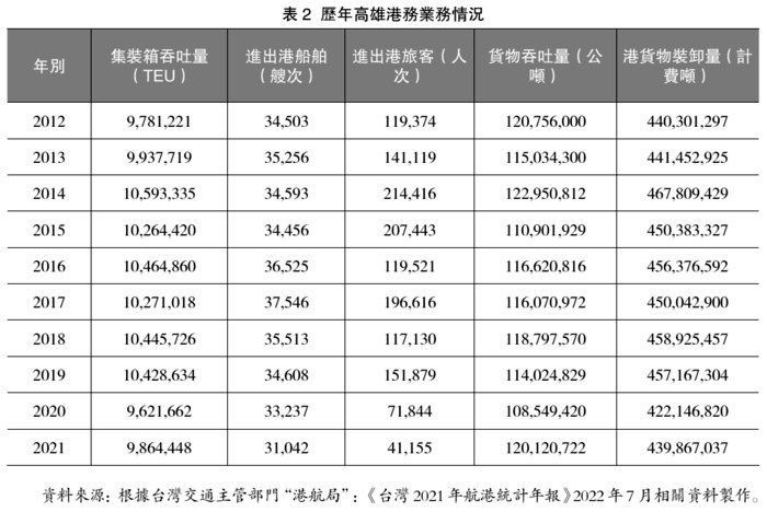 ⑦台湾交通主管部门“港航局”:《台湾2021年航港统计年报》,2022年7月,第39页。