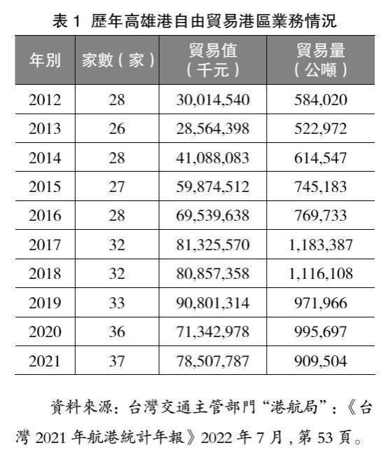 在采取一系列发展与改革措施后,高雄港口经济确实有所进步。在陆续兴建高雄第六货柜中心--实施高雄港洲际货柜中心第一、二期工程后,自2020年起又推动实施高雄港第七货柜中心计划--营运设施及基础设施工程,同时推动实施高雄港客运专区建设计划,兴建旅运与港口功能合一的旅运大楼,打造现代化旅运通关与智慧大楼。高雄港自由贸易港区业务也有所扩大。由表1可见,2012-2021年,入驻企业由28家增至37家;贸易值由300.15亿元增至785.08亿元;贸易量则由584,020公吨增至909,504公吨。