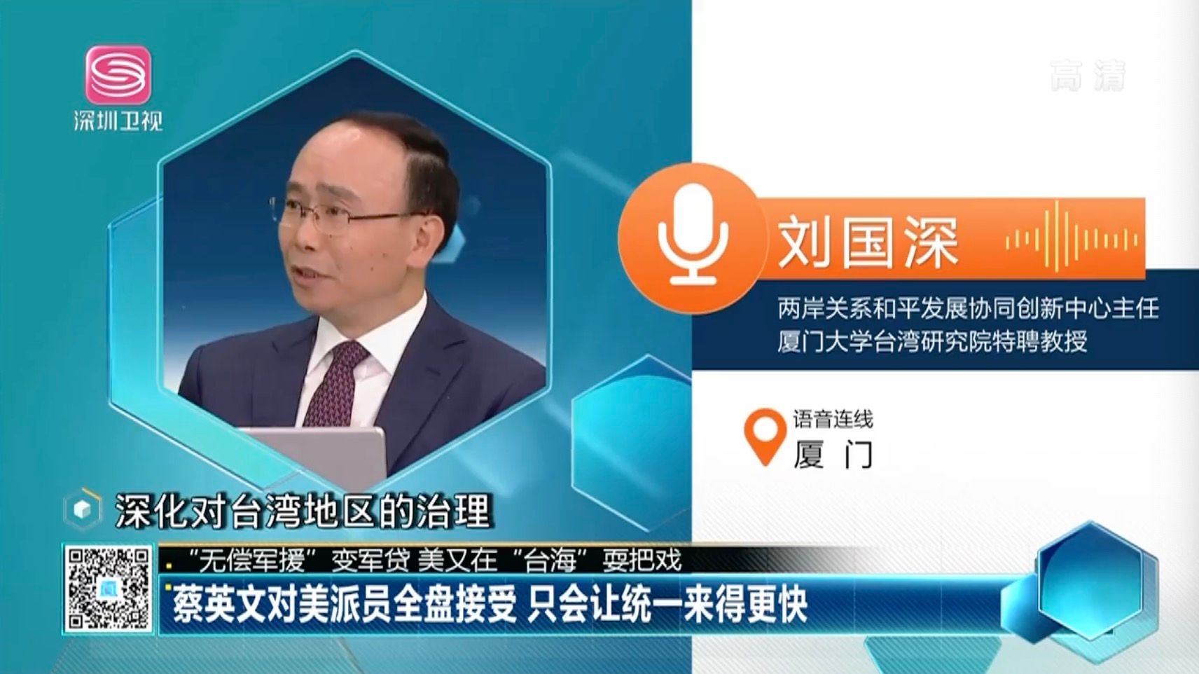 近日,两岸关系和平发展协同创新中心主任、厦门大学台湾研究院特聘教授刘国深就“美方欲机制化派公务人员窜台”等相关话题接受深圳卫视《决胜制高点》节目的电话连线采访。