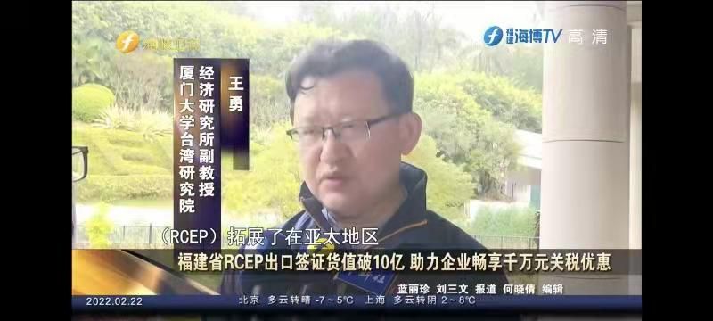 2022年2月22日上午,我院经济所所长王勇副教授接受福建省《海峡卫视》记者专访。本期主题为:“福建省RCEP出口签证货值破10亿 助力企业畅享千万元关税优惠”,主要就RCEP启动生效对福建省企业进一步拓展RCEP成员国市场及对闽台经贸合作的影响,同时对台湾地区未来加入RCEP 的可能性等进行了分析和研判。