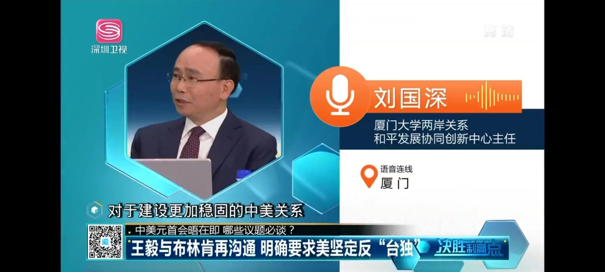 厦门大学两岸关系和平发展协同创新中心主任刘国深教授11月15日接受深圳卫视决胜制高点节目采访。