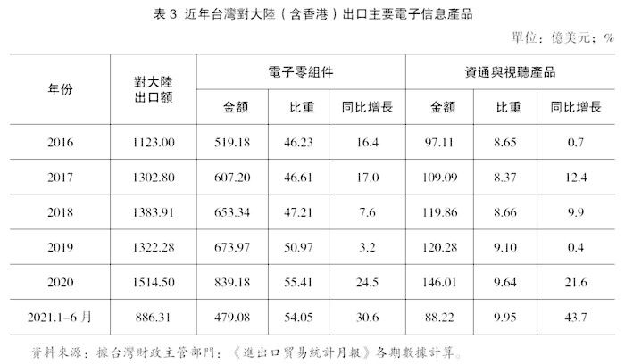 第三,稳固的两岸产业供应链是支撑两岸贸易的根本基础。长期以来两岸经贸往来具有突出的“投资拉动贸易”特点。在大量台商对大陆投资的带动下,台湾相关机器设备、工业原材料及半成品大量对大陆出口,而在大陆加工完成的半成品或制成品销往海外市场或回销台湾岛内,在此过程中两岸产业逐渐形成了稳固的产业供应链关系,其中两岸电子信息产业供应链尤为突出。近年来,尽管台商大陆投资趋缓,也难憾动这种长期形成的供应链。这就是两岸贸易在内外政经环境不利情况下依旧能波动向前发展的根本保障。2020年两岸贸易互动情形便是很好的例证。在新冠疫情持续蔓延背景下,远距离商机激增,宅经济兴旺,新兴科技应用加速发展,市场进一步提高对电子零组件、资通讯产品的需求,这就带动岛内相关产业供应链出货加快,台湾对大陆出口因此大幅增长。2020年,台湾对大陆出口电子零组件金额为839.18亿美元,较上年大幅增长24.5%,占对大陆出口比重高达55.41%;资通与视听产品出口额为146.01亿美元,较上年增长21.6%,占对大陆出口比重高达9.6%,二者合计所占比重高达65.05%。2021年以来两岸贸易继续保持这种发展格局,带动了两岸贸易高增长。(参见表3)