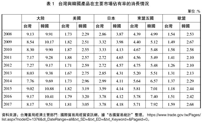 表1:台湾与韩国产品在主要市场占有率的消长情况