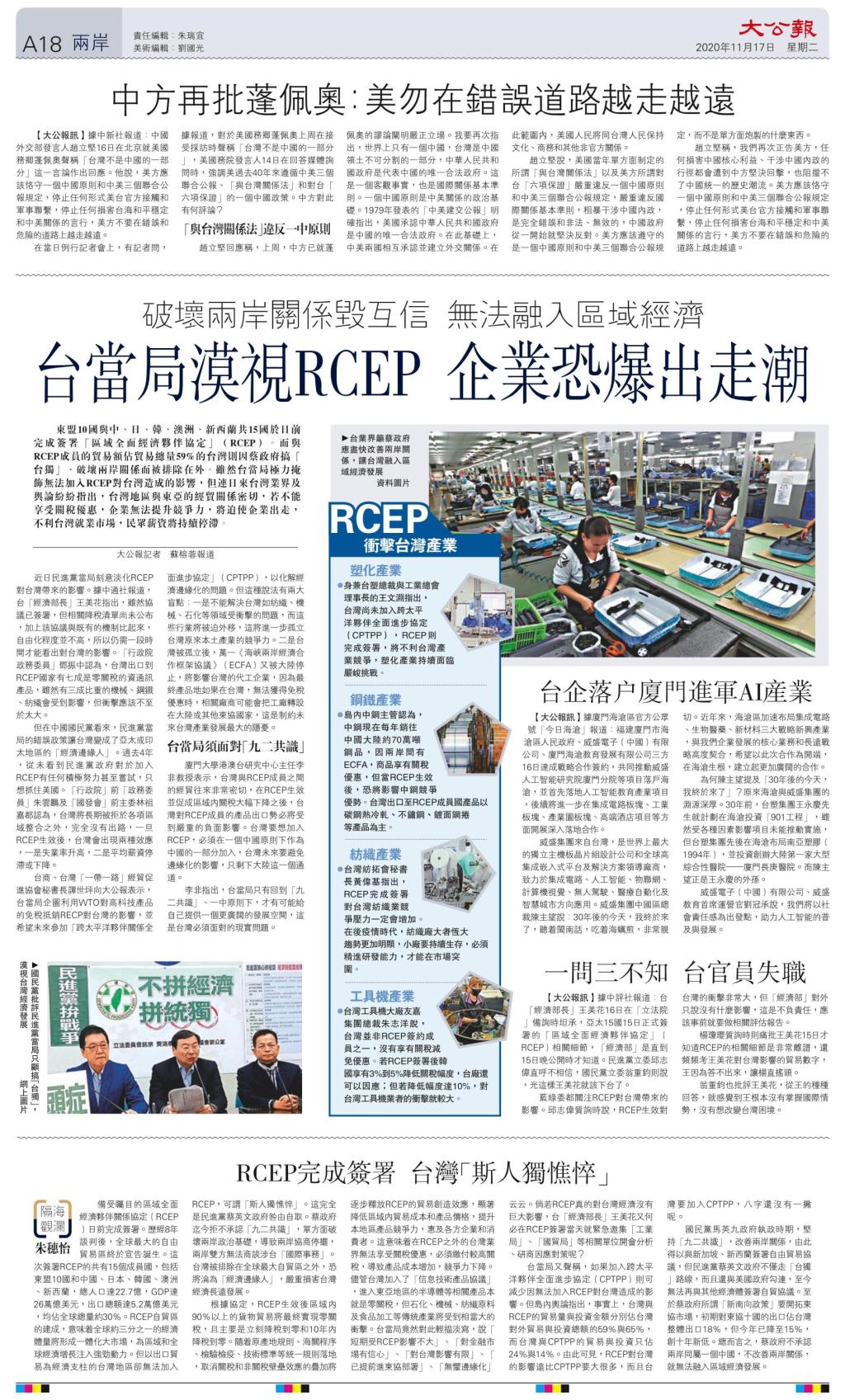 (大公报 记者苏榕蓉 11月17日报道)东盟10国与中、日、韩、澳洲、新西兰共15国于日前完成签署“区域全面经济伙伴协议”(RCEP)。而与RCEP成员的贸易额占贸易总量59%的台湾则因蔡政府搞“台独”、破坏两岸关系而被排除在外。虽然台当局极力掩饰无法加入RCEP对台湾造成的影响,但连日来台湾业界及舆论纷纷指出,台湾地区与东亚的经贸关系密切,若不能享受关税优惠,企业无法提升竞争力,将迫使企业出走,不利台湾就业市场,民众薪资将持续停滞。