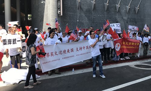 Chinese demonstrators sing songs and chant slogans while waiting for the arrival of Taiwan leader Tsai Ing-wen in Los Angeles in August 2018. As Tsai arrived at the Intercontinental Hotel, she was greeted by peaceful Chinese demonstrators of all ages and from all walks of life. They were holding flags, banners and signs bearing the slogan One China. The crowd began chanting One China! and Oppose Taiwan Independence! as Tsai pulled into the hotel. Photo: Wang Rujun