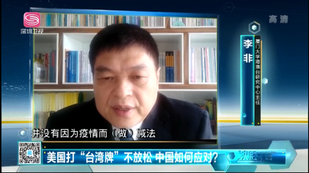 李非:美国围堵中国的战略,并没有因为疫情而(做)减法,反而变本加厉、落井下石,在疫情初期打压限制大陆,千方百计地抹黑大陆。现在我们大陆疫情得到控制的时候,美国自己反而深陷疫情威胁的时候,美国也丝毫没有放松,还继续抹黑,要“甩锅”大陆。所谓的外交战,形式就更加严峻,就更加复杂,当然对两岸关系产生负面的影响,产生的阴影越来越多。
