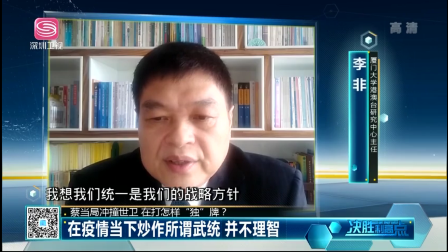 李非:我想统一是我们的战略方针,我们一定要实现。但是统一也要看时机,要看条件是否成熟。现在全球都在共同抗疫,遏制新冠疫情的蔓延,这是首要的任务,所以现在还不是国家统一的良机。尽管美国的航母也有些人受到感染,它的作战能力恐怕下降甚至停摆,但是我们现在的主要任务还是要共同面对疫情,联合抗疫。当然国家统一我们将来也是要做的,但不是现在,而是未来。