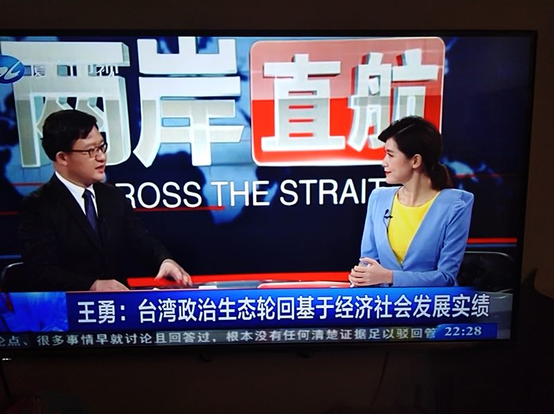 2018年4月30日傍晚,厦门大学台湾研究院经济所王勇副教授受邀于厦门卫视录制《两岸直航》节目,本期节目主题为:“蔡当局‘拔管’,是谁无药可救?”。同时,共同进行节目录制的其他两位连线嘉宾分别为:台北台湾中国文化大学广告学系主任钮则勋教授,高雄义守大学财经金融系李梁坚副教授。