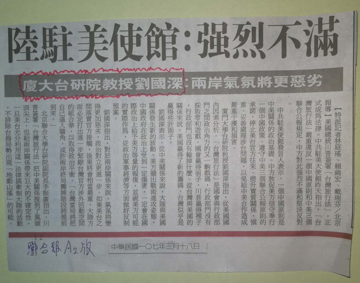 刘国深表示,从中美关系来说,大陆与美国关系发生新的波动,美方摆出战术进攻姿态,中国政府在政治上受到一定伤害,一定会在国际政治上给予美方等量的报复,并视美方可能的实际作为,从政治军事经济等方面做好反制预案。