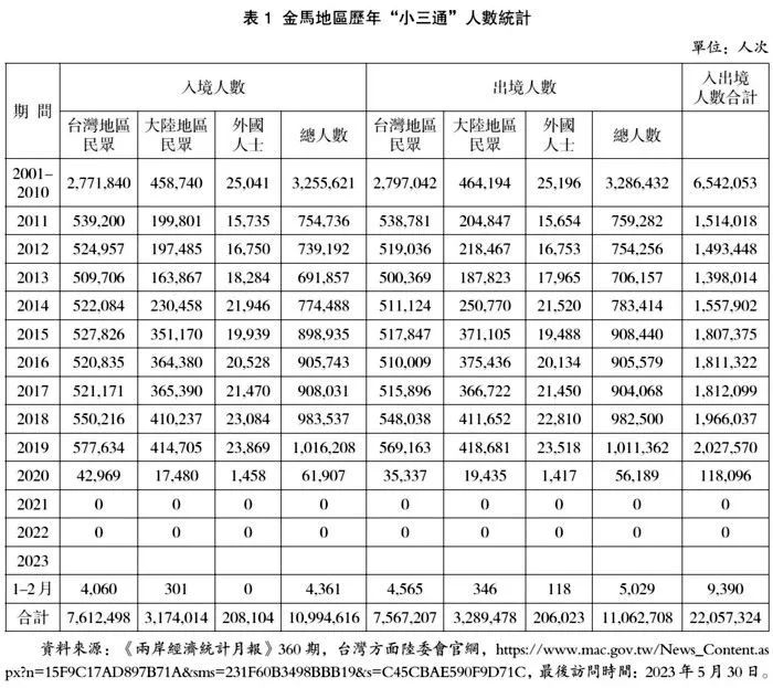 在推进两岸社会融合发展过程中,人员互动与往来是最基本的前提条件与最直接的路径选择。通过极具规模、方便快捷的群际互动,增进彼此间的瞭解与理解,可扩大“重叠共识”消除误解歧见。不断进行关系建构,深化人员社会交融,进而形塑“共同记忆”,强化“共同体意识”。多年来,福建借助两岸地缘优势,稳步推进与台湾外岛的人员交流,为推动闽台区域融合创造基础性条件。此举成为福建在大陆各个省份中,推动两岸融合发展中不容小觑的比较优势。早在1992年,福建方面便提出“两马(马尾、马祖)先行,两门(厦门、金门)对开”的构想,即尝试用福建的厦门与金门、马尾与马祖之间的直接通航,来带动两岸“三通”,实现两岸人员直接交往的新突破。〔11〕2001年元月,福建沿海与金门、马祖地区完成了直接往来首航,为2008年两岸实现全面“三通”积累了宝贵经验。〔12〕据台湾方面陆委会公布的统计数据显示,从2001年至2023年2月,通过搭乘金马“小三通”往返于两岸的两岸民众,人次总计达到2164万3197人次。其中,台湾民众1517万9705人次;大陆民众646万3492人次(见表1)。