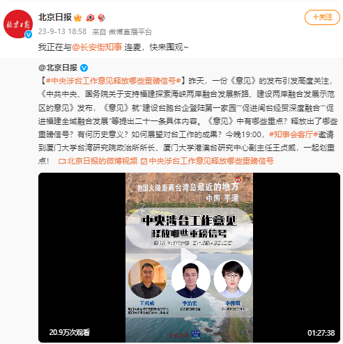 9月13日,厦门大学台湾研究院政治所所长、厦门大学港澳台研究中心副主任王贞威副教授,应《北京日报》微博微信编辑部邀请,作客“知事会客厅”与长安街知事记者共同参与重磅话题“对台工作二十一条发布,释放哪些重磅信号?”微博连麦。在线访谈效果不错,引发广大网友关注。一个小时左右的时间,吸引了超过20万网友点阅围观。