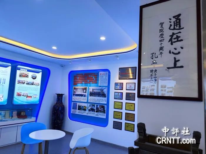 厦大台研院一楼展示厅里挂着陈孔立教授题写的字“通在心上”。(中评社 林艳摄)