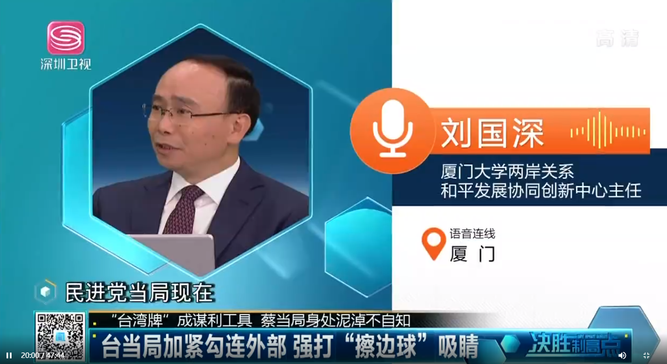 两岸关系和平发展协同创新中心主任、厦门大学台湾研究院特聘教授刘国深1月24日接受深圳卫视决胜制高点节目连线采访。