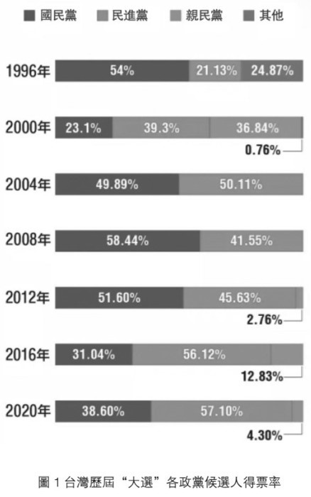 台湾社会意识形态与政治生态结构从量变到质变的转变,基本上直观地体现在历届大选中国民两党或蓝绿两大阵营所推出的台湾地区领导人候选人的得票率及所谓“立法委员”选举中国、民两党或蓝绿两大阵营“立法委员”的席次的此消彼长的变化中。