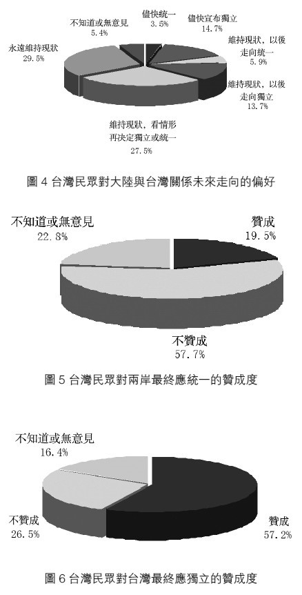 民调也显示,台湾民众对两岸关系的主要倾向(76.6%)仍然停留在维持现状上。但维持现状偏向独立的比例(28.4%)是偏向统一比例(9.4%)的3倍左右;不赞成两岸最终应统一的比例(57.7%)是赞成者(19.5%)的近3倍,赞成台湾最终应该独立成为一个新国家的比例(57.2%)是不赞成者(26.5%)的2.2倍。