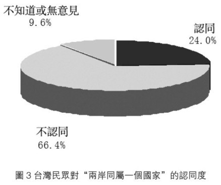 注:受访者对“大陆和台湾同属一个国家,但这个国家的名字两岸认知上有所不同,大陆方面称它为中华人民共和国,台湾方面称它为‘中华民国’”,不认同的比例高达66.4%,认同者为24.0%,而不知道或无意见者9.6%。