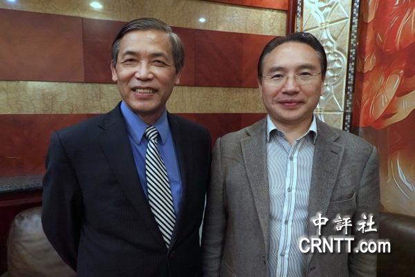 华夏政略研究会负责人王中平教授(左)和唐永红教授(中评社记者 宋楷文摄)