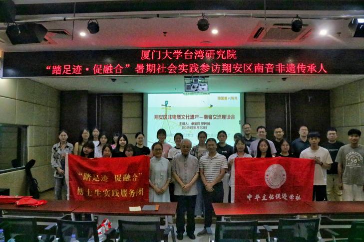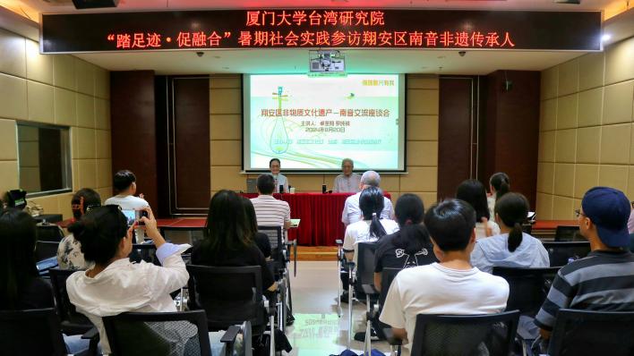 2024年8月20日下午,台湾研究院党委副书记陈文、文学所所长刘奎教授、辅导员林晓培带着我院暑期实践队慕名来到了厦门市翔安区文化馆,走访来自台湾的南音名家、国家级非遗代表性传承人卓圣翔老师和省级非遗代表性传承人罗纯祯老师,领略了南音的艺术魅力与文化价值。