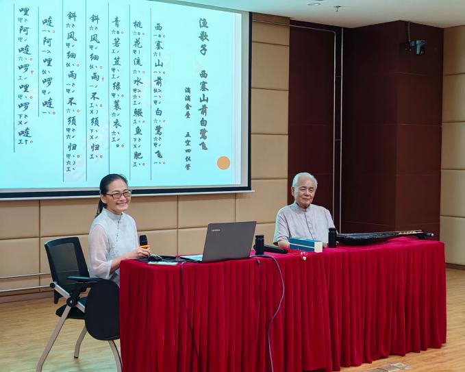 两位大师还现场指导实践队用南音学唱由卓圣翔老师作曲的《渔歌子·西塞山前白鹭飞》。罗纯祯老师悉心指导实践队员们的发音、咬字和唱腔,引导大家在演唱时将音调流转与情感流动自然融和。随后两位大师还演绎了《春怨·打起黄莺儿》和《将进酒》两首曲目。