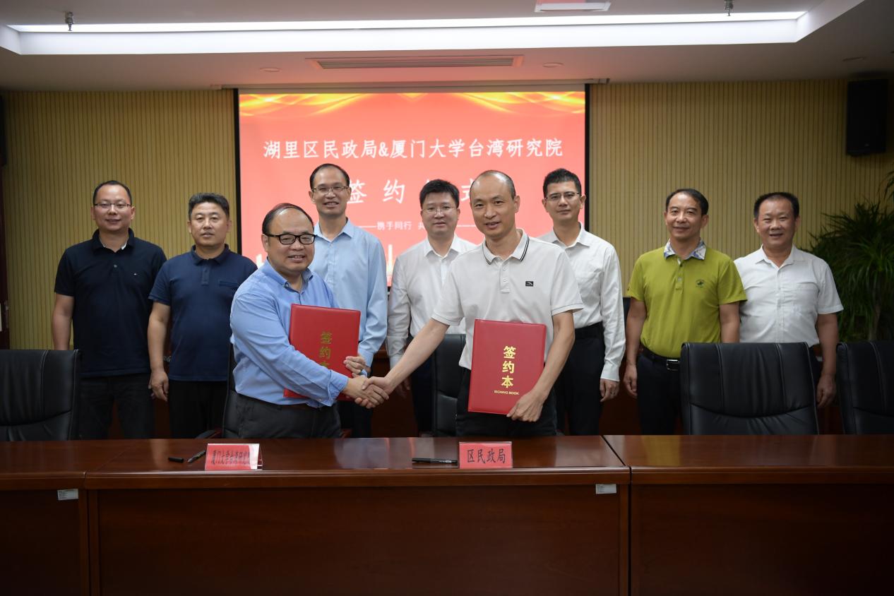 为深入贯彻落实中共中央、国务院《关于支持福建探索海峡两岸融合发展新路、建设两岸融合发展示范区的意见》,加强校地合作,更好地服务地方发展。在前期充分调研、论证基础上,11月2日在湖里区政府举行厦门大学台湾研究院与湖里区民政局签约仪式。我院郭锦星书记、湖里区陈晓东副书记、邓小达副区长,共同见证张文生副院长与湖里区民政局曹军勇局长代表双方单位签订《框架合作协议》,该协议旨在发挥双方优势资源,共同打造台胞台企登陆“第一家园”,深化两岸融合发展。我院社会研究所执行所长肖日葵、湖里区委办、台办等相关职能部门领导一同出席。