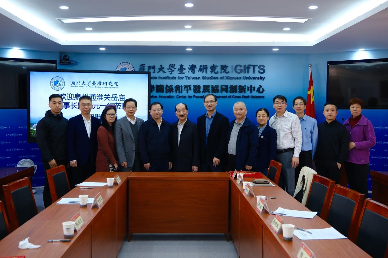 泉州通淮关岳庙是福建现存规模最大的关帝庙,也是历史上大陆最早分灵到台湾的“香缘祖庙”,被称为“台湾开基第一庙”,是东南亚和港澳台地区600多间关帝庙的“祖庭”,在1992年被列为市级文物保护单位,2005年被列为省级文物保护单位,2011年获批进入省级非物质文化遗产名录,在两岸民间信俗交往实践活动中开展了大量工作。此次到访,是双方深入学习贯彻《中共中央 国务院关于支持福建探索海峡两岸融合发展新路 建设两岸融合发展示范区的意见》的重要举措,为双方开启合作探索扩大闽台社会人文交流合作和促进闽台文化领域融合发展等新机制新做法的打下了良好基础。