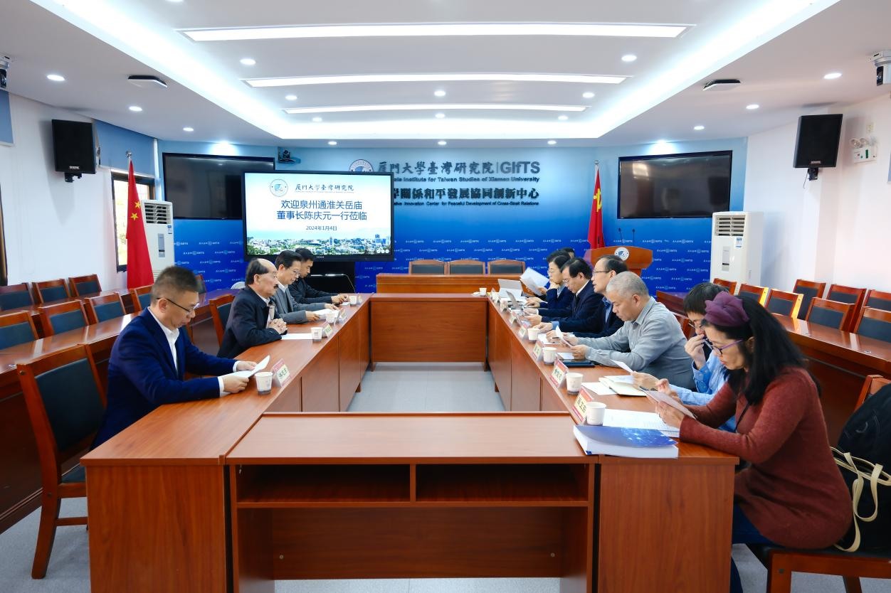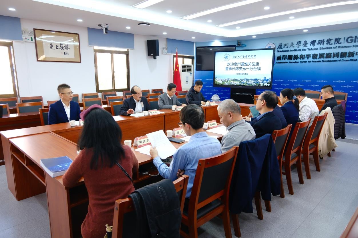 陈庆元董事长对台湾研究院的热情接待表示衷心感谢。他指出,泉州通淮关岳庙是历史上最早从大陆分灵到台湾的“香缘祖庙”,承载了促进闽台民间信仰文化交流的特殊功能。他表示,台湾研究院在涉台研究领域成果丰硕,研究基础雄厚,具有明显的学术专业优势,能够为关岳庙的对台交流工作的开展提供强大的智力支持。他也表示,希望未来双方能够加强联系互动,共同助力福建两岸融合发展示范区的建设。