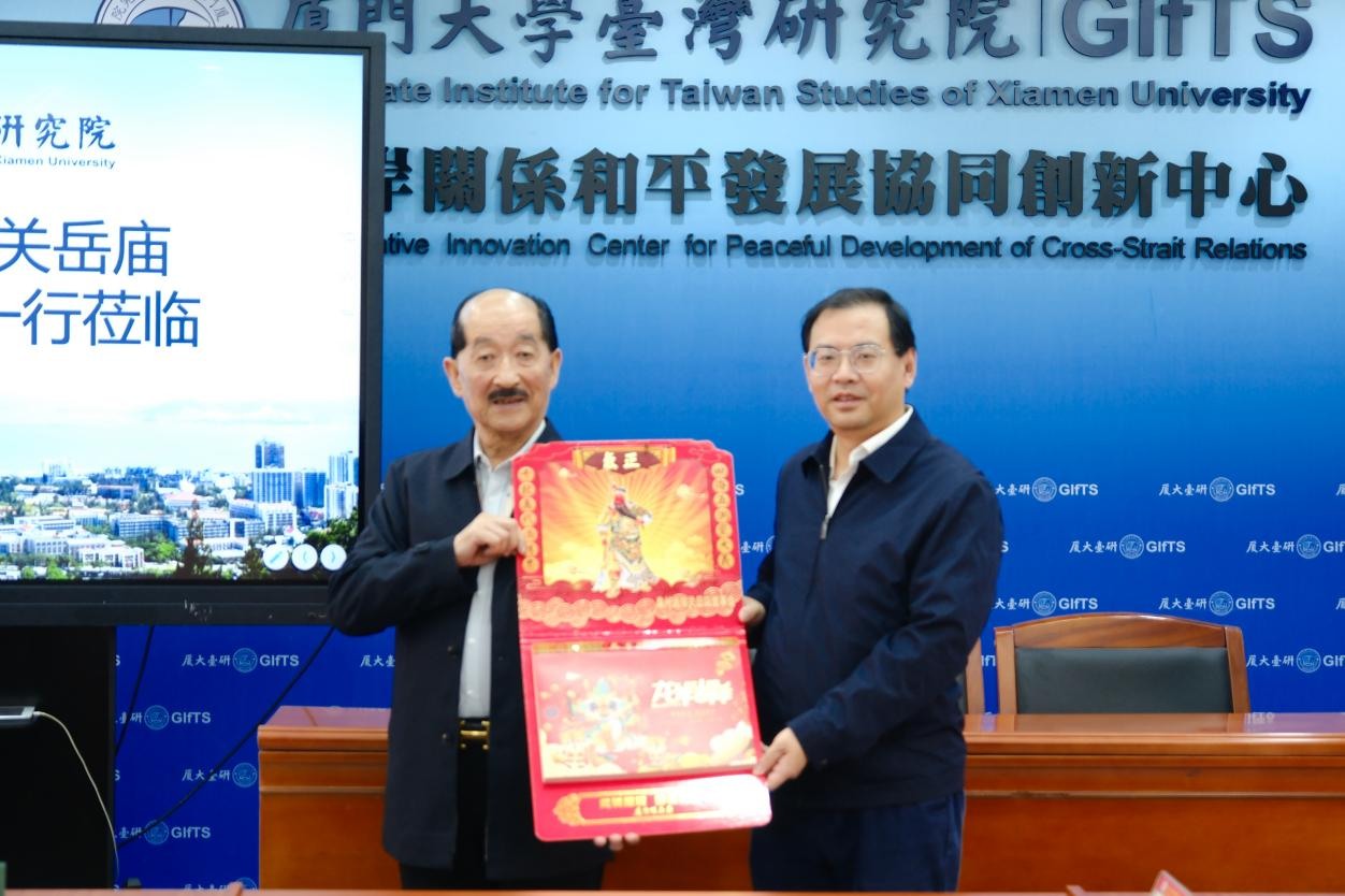 最后,陈庆元董事长代表参访团向我院赠送了纪念品,对我院的周到接待再次表达感谢。李鹏院长代表接收纪念品,并表示今后将与通淮关岳庙保持密切沟通,也期待未来能够为关岳庙在两岸民间信仰文化交流的各项工作开展中提供助力。