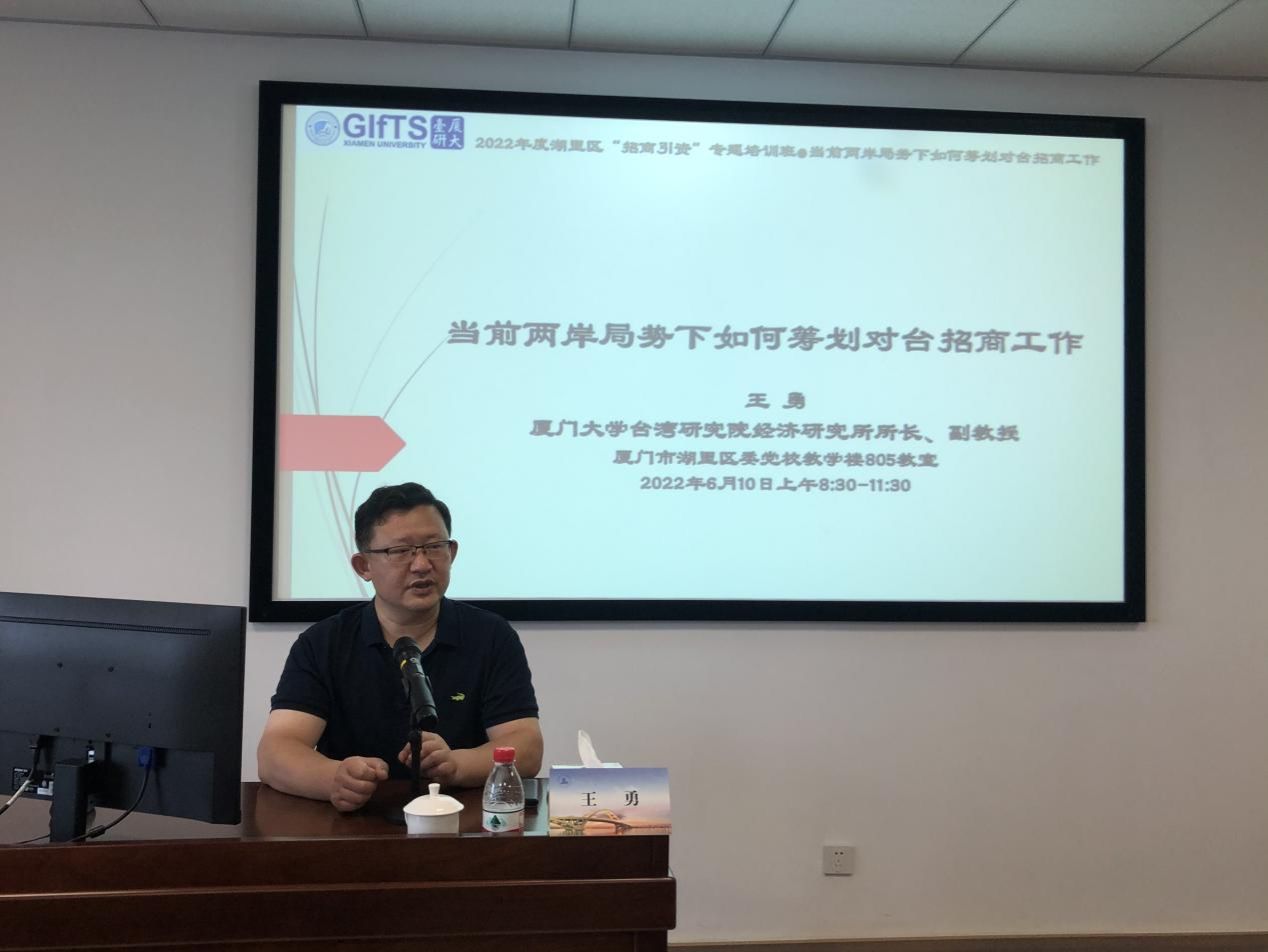 受厦门市湖里区委党校、湖里区商务局的邀请,2022年6月10日上午,我院经济所所长王勇副教授在湖里区委党校,为湖里区商务局、湖里区台胞创新驿站等单位负责人和分管对台招商引资业务主管等60多人做关于“2022年度湖里区‘招商引资’专题培训班专题讲座,主题为:《当前两岸局势下如何筹划对台招商工作》。讲座主要涵盖当前国际局势与台海形势对台招商引资的影响、台湾经济发展新态势对开展对台招商引资的影响,ECFA对两岸经贸合作的影响等方面,并结合推动两岸对台产业合作的案例,分析了厦门对台招商引资的发展现况及政策影响,以及新形势下厦门创新对台招商引资的思路等方面内容。报告内容图文并茂,逻辑思路清晰,分析深入全面,王勇副教授提出的相关观点得到与会嘉宾的充分肯定和认同,讲座现场互动热烈,取得良好效果。