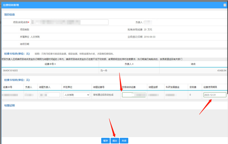 第三步:到个人财务系统核对需要结转的金额,填入财务结余经费,点击提交即可(目前国家社科 教育部 省社科等纵向项目结余经费无使用期限限制,如管理办法有规定使用期限的按照具体管理办法执行)。提交之后请联系学院科研秘书先审核,学院审核完之后提交学校社科处审核。