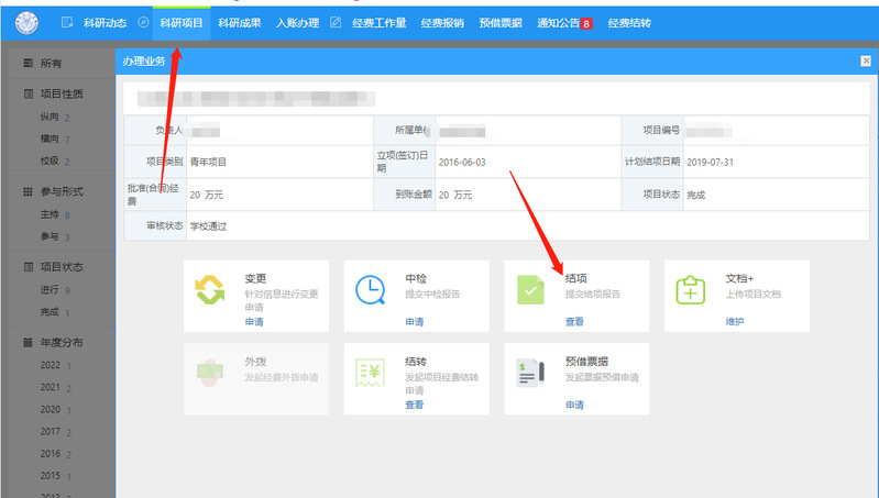 第一步:在社科系统中点击科研项目,申请结项,填写结项信息,等待项目管理员审核。