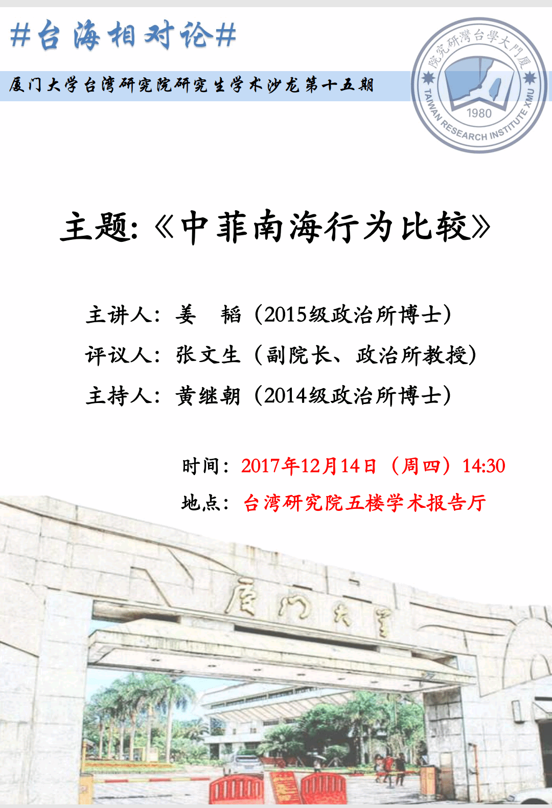 2017年12月14日下午2:30,厦门大学台湾研究院“台海相对论”系列活动——第十五期研究生学术沙龙在学院五楼学术报告厅举行。本次学术沙龙由厦门大学台湾研究院政治所姜韬博士开讲,主题为“中菲南海行为比较”。两岸关系和平发展协同创新中心专家、厦大台研院副院长张文生教授作评议人,政治所黄继朝博士作主持人。政治所部分硕博士生与会。