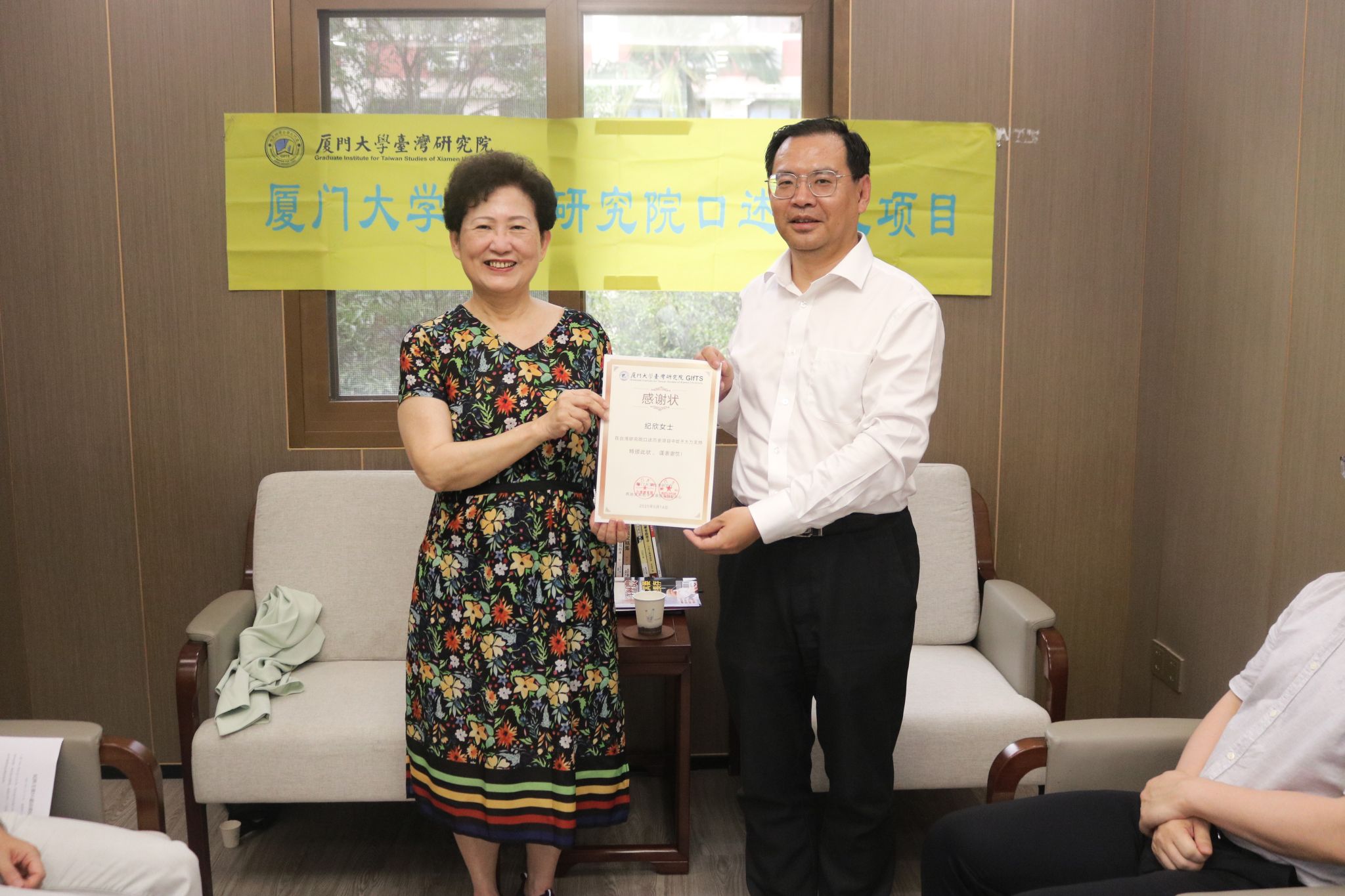 2025年6月14日,中国统一联盟前主席、《观察》杂志发行人纪欣女士应邀接受厦门大学台湾研究院口述历史项目访谈。李鹏院长主持口述访谈项目并致欢迎辞,简要介绍“厦门大学台湾研究院口述历史项目”后,向纪欣女士颁发感谢状。王玉国老师等负责本次访谈的题目设计和现场访谈。