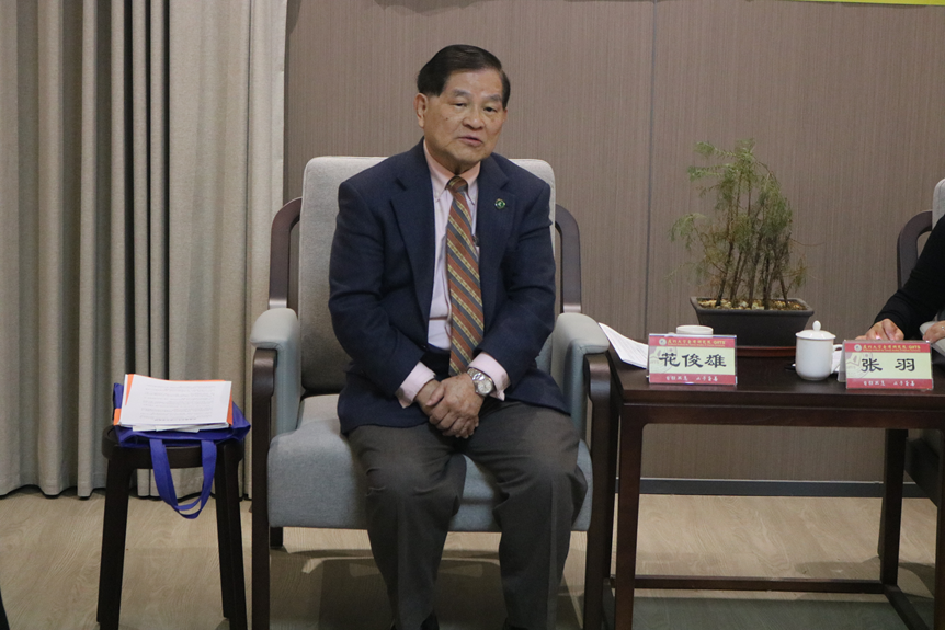 张羽副院长向花俊雄会长致欢迎辞,简要介绍“厦门大学台湾研究院口述历史项目”,并向花俊雄会长颁发感谢状。王玉国老师等负责本次访谈的题目设计和现场访谈,围绕花俊雄会长的求学经历、赴美留学、参与保钓、回国探亲、和平统一、联合国工作等展开访谈。作为海外保钓运动的亲历者、两岸统一事业的倡导者,花俊雄会长以84岁高龄回首峥嵘岁月,还原20世纪中后期台湾知识分子的爱国抉择与家国情怀,对未来台湾的出路提出思考与期盼。谈及两岸关系前景,花俊雄会长目光坚定地表示:“中国大陆的军事和经济实力已今非昔比,完全有能力遏制‘台独’。但更重要的是,我们要让台湾年轻人明白,他们的根在中国!”花俊雄会长的口述访谈不仅记录了两岸关系及中美关系的变迁,更展示了一位台湾知识分子的家国情怀。