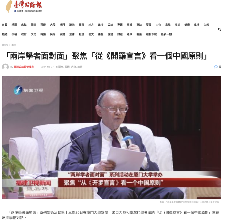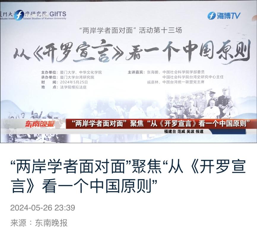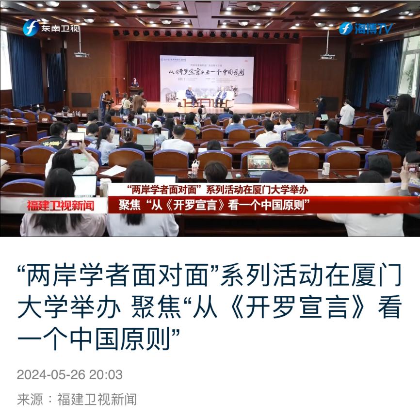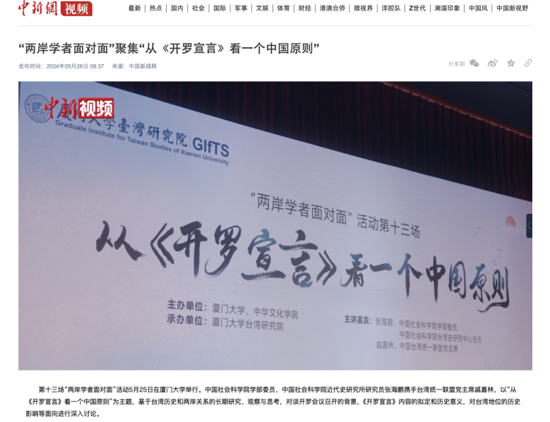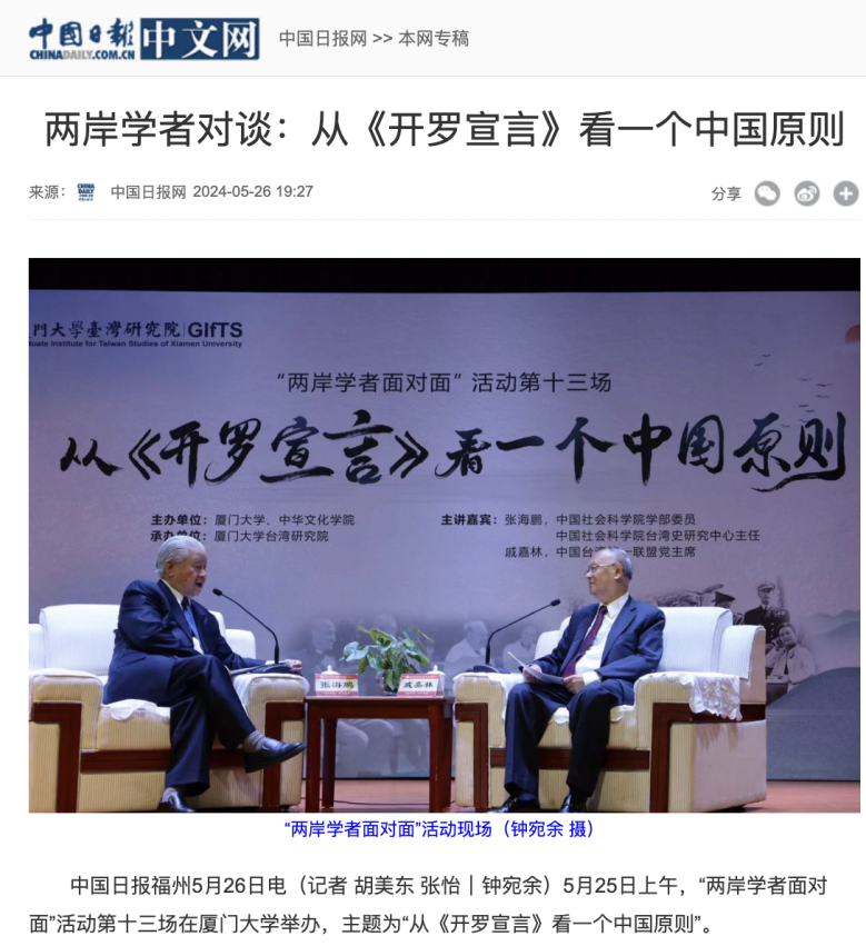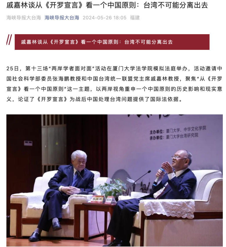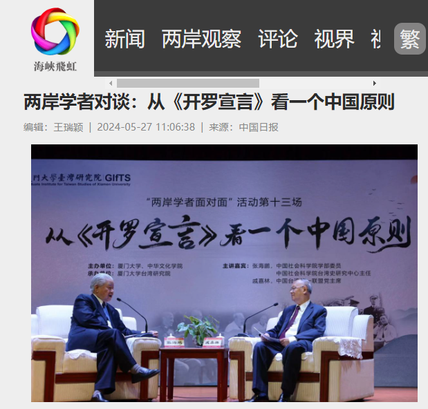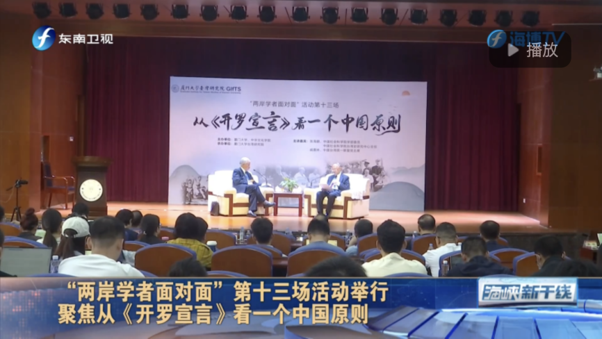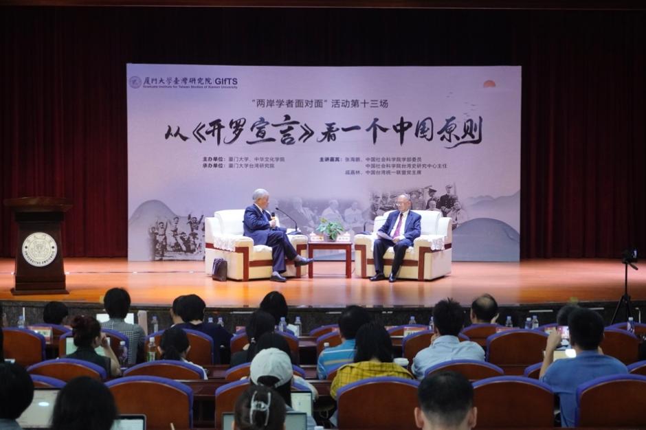 近期,由厦门大学和中华文化学院共同主办的“两岸学者面对面”系列活动第十三场在厦门大学法学院模拟法庭举办。中国社会科学院学部委员、中国社会科学院近代史研究所研究员张海鹏与台湾统一联盟党主席戚嘉林以“从《开罗宣言》看一个中国原则”为主题展开对谈。该活动受到境内外媒体的广泛关注。