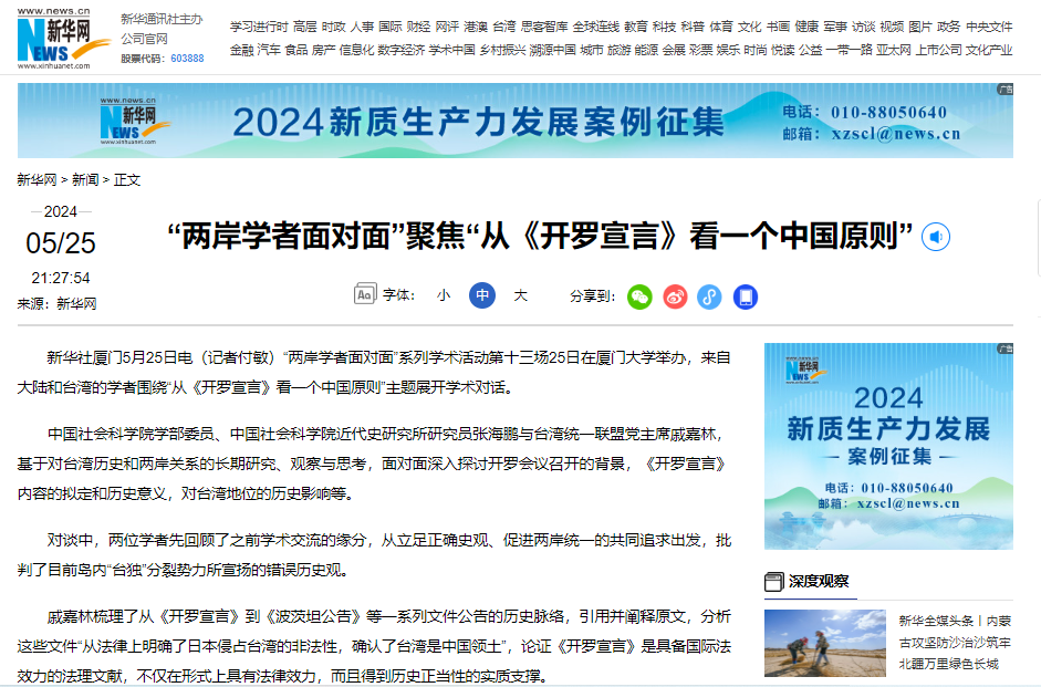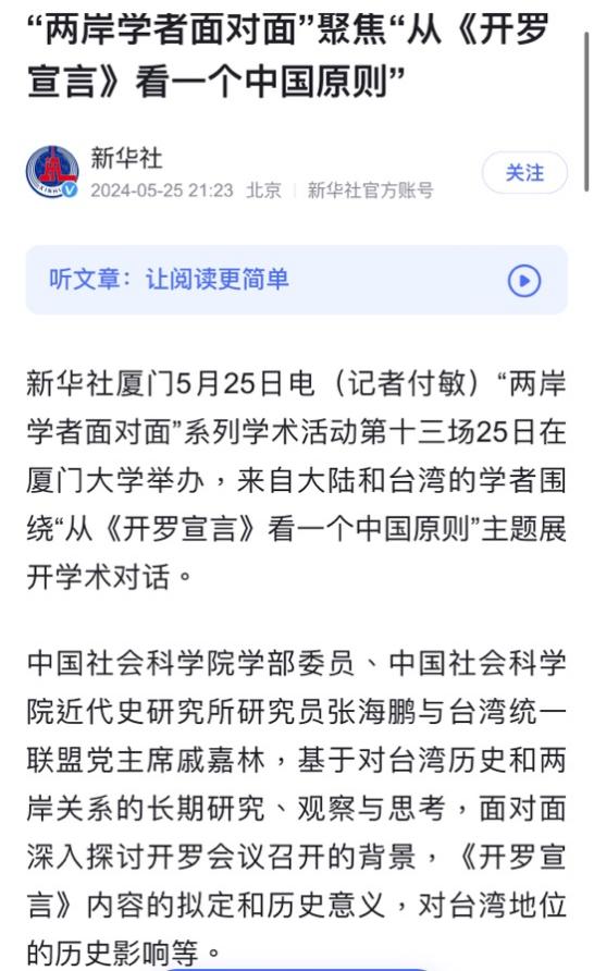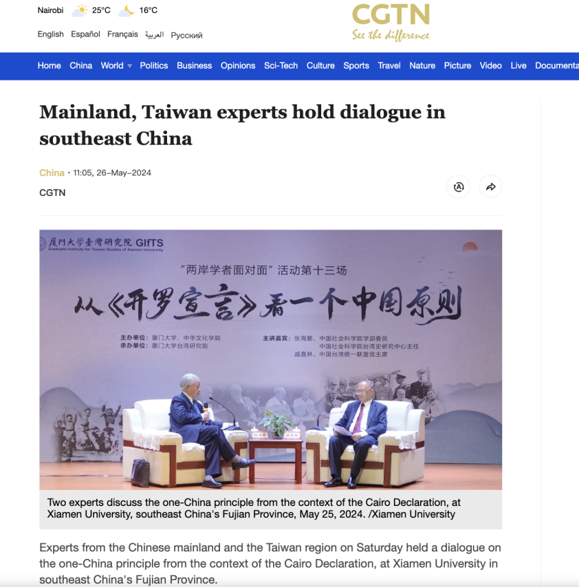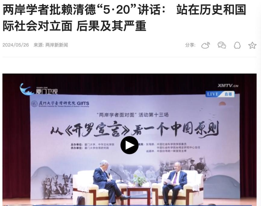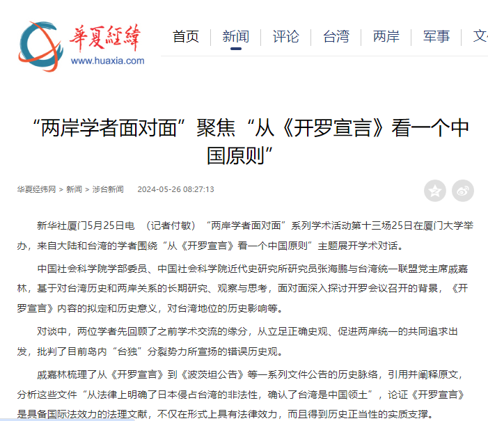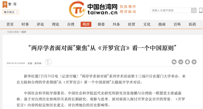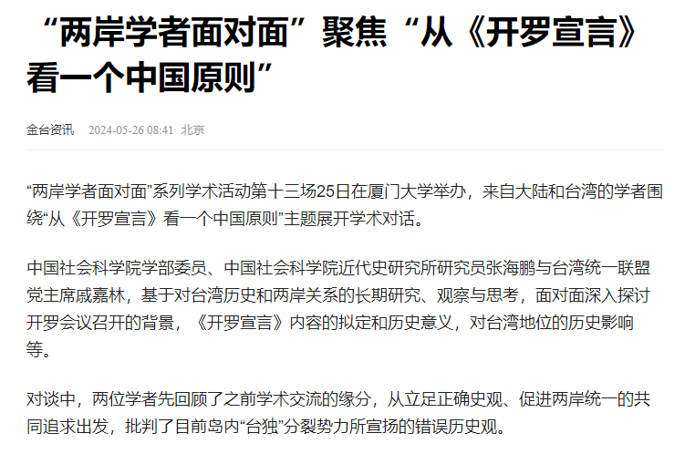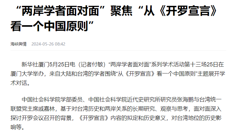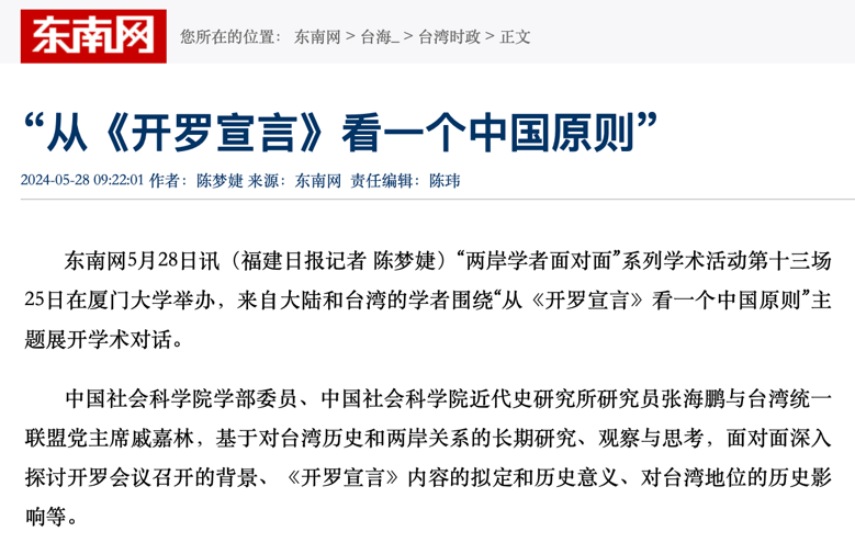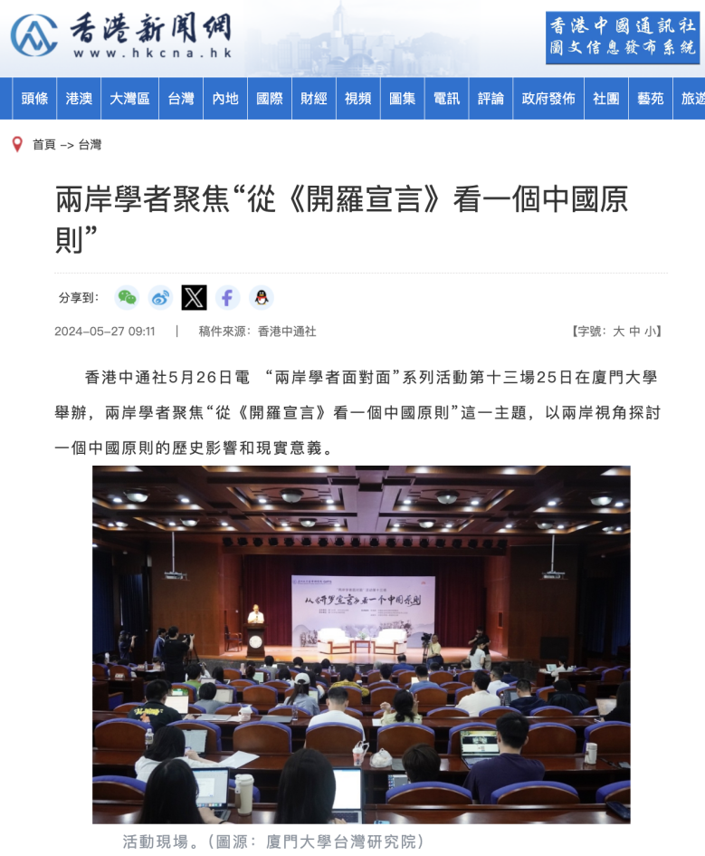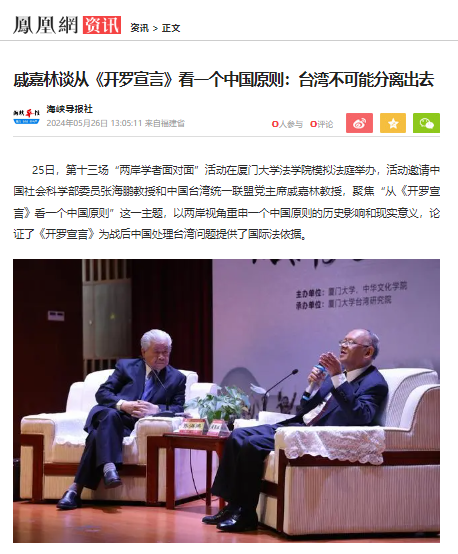 近期,由厦门大学和中华文化学院共同主办的“两岸学者面对面”系列活动第十三场在厦门大学法学院模拟法庭举办。中国社会科学院学部委员、中国社会科学院近代史研究所研究员张海鹏与台湾统一联盟党主席戚嘉林以“从《开罗宣言》看一个中国原则”为主题展开对谈。该活动受到境内外媒体的广泛关注。