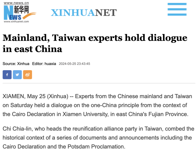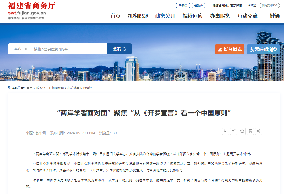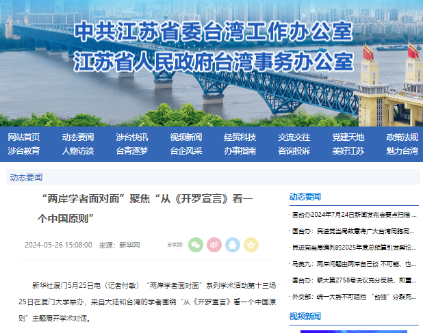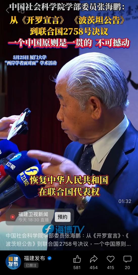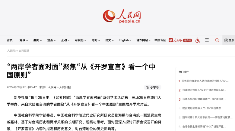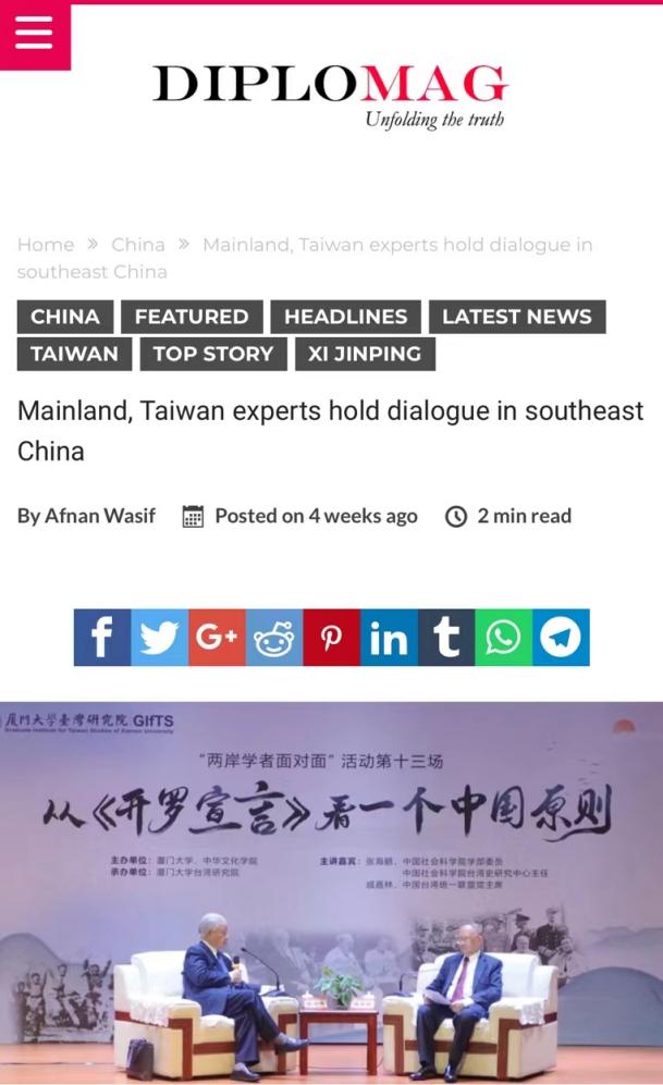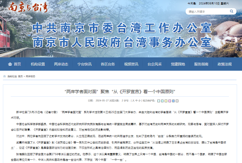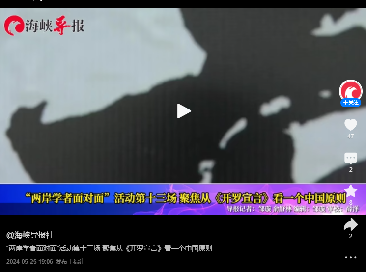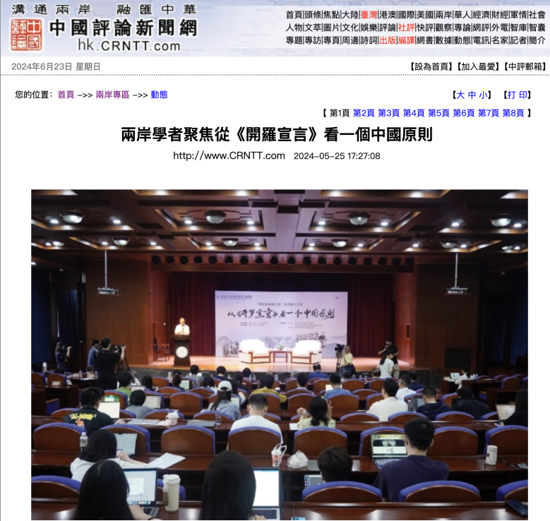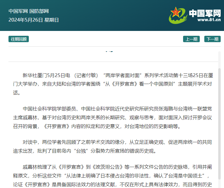 近期,由厦门大学和中华文化学院共同主办的“两岸学者面对面”系列活动第十三场在厦门大学法学院模拟法庭举办。中国社会科学院学部委员、中国社会科学院近代史研究所研究员张海鹏与台湾统一联盟党主席戚嘉林以“从《开罗宣言》看一个中国原则”为主题展开对谈。该活动受到境内外媒体的广泛关注。