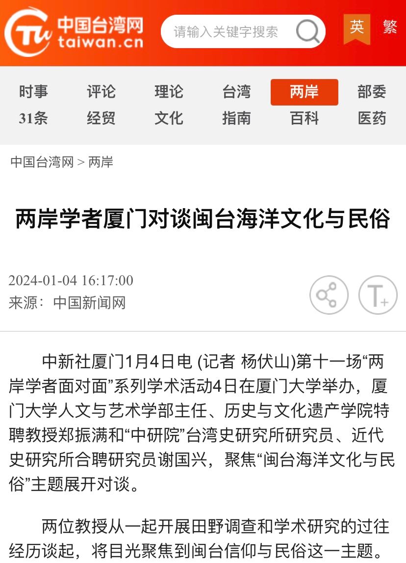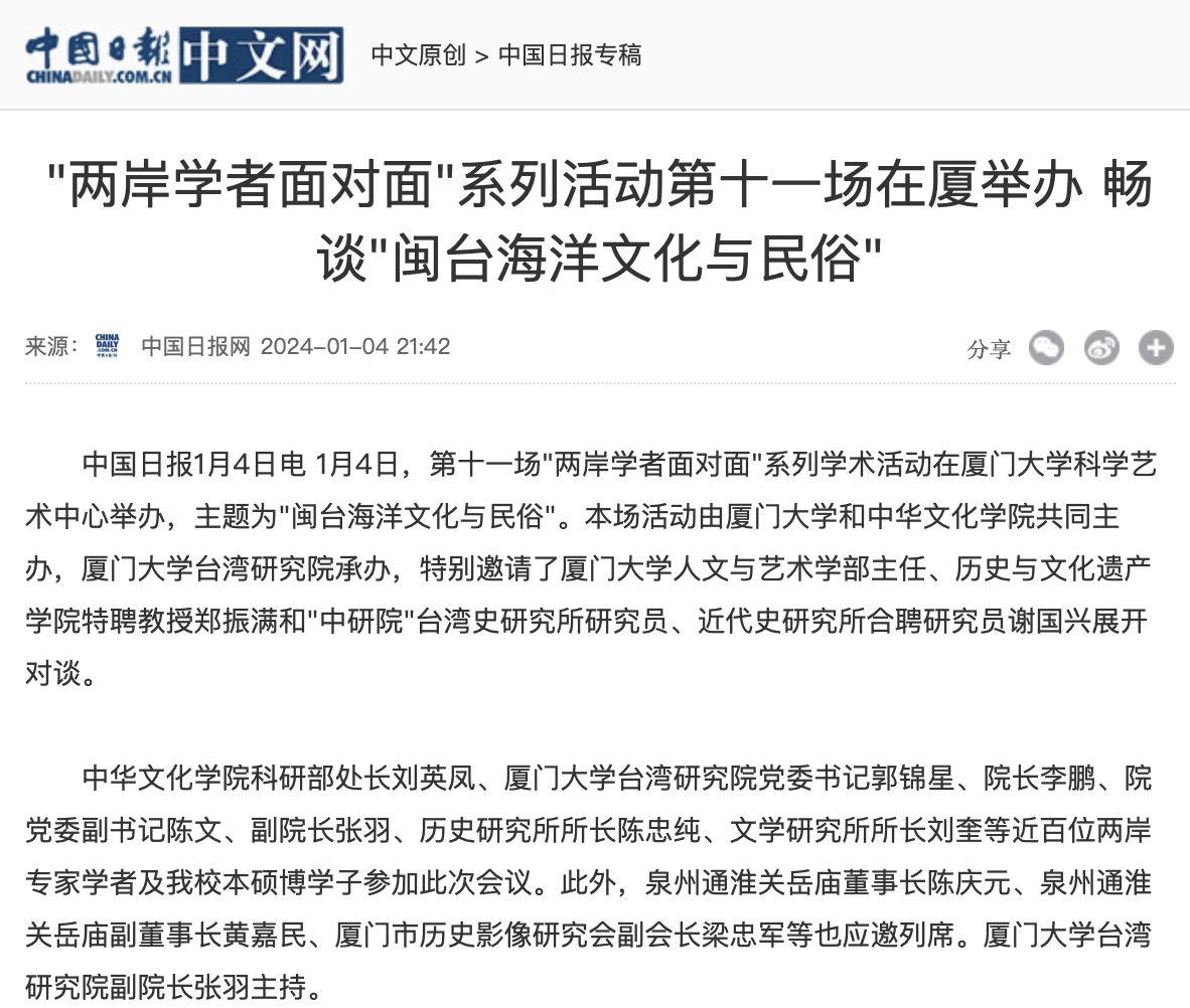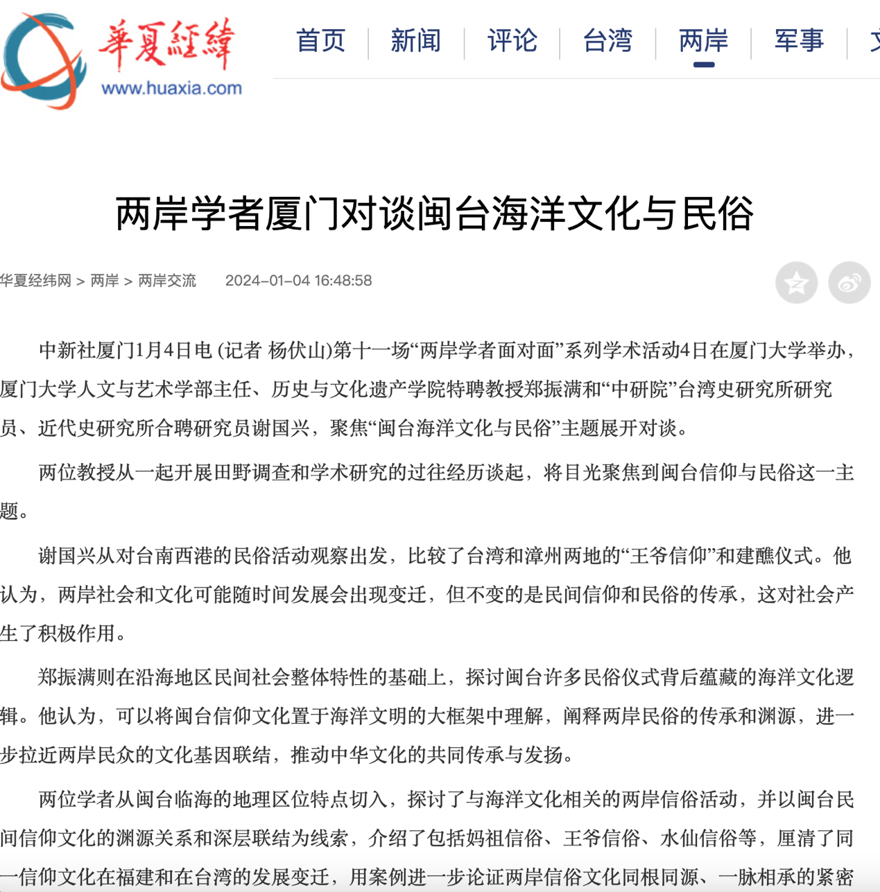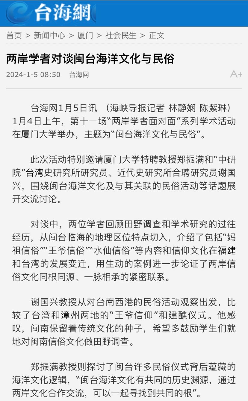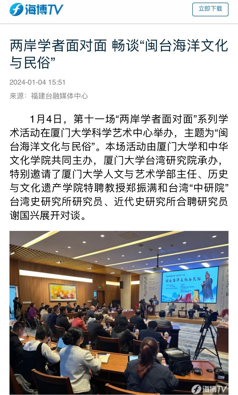 近日,由厦门大学和中华文化学院共同主办的“两岸学者面对面”系列活动第十一场在厦门大学科学艺术中心举办。厦门大学人文与艺术学部主任、历史与文化遗产学院特聘教授郑振满和“中研院”台湾史研究所研究员、近代史研究所合聘研究员谢国兴以“闽台海洋文化与民俗”为主题展开对谈。该活动引起了海内外媒体的广泛关注。