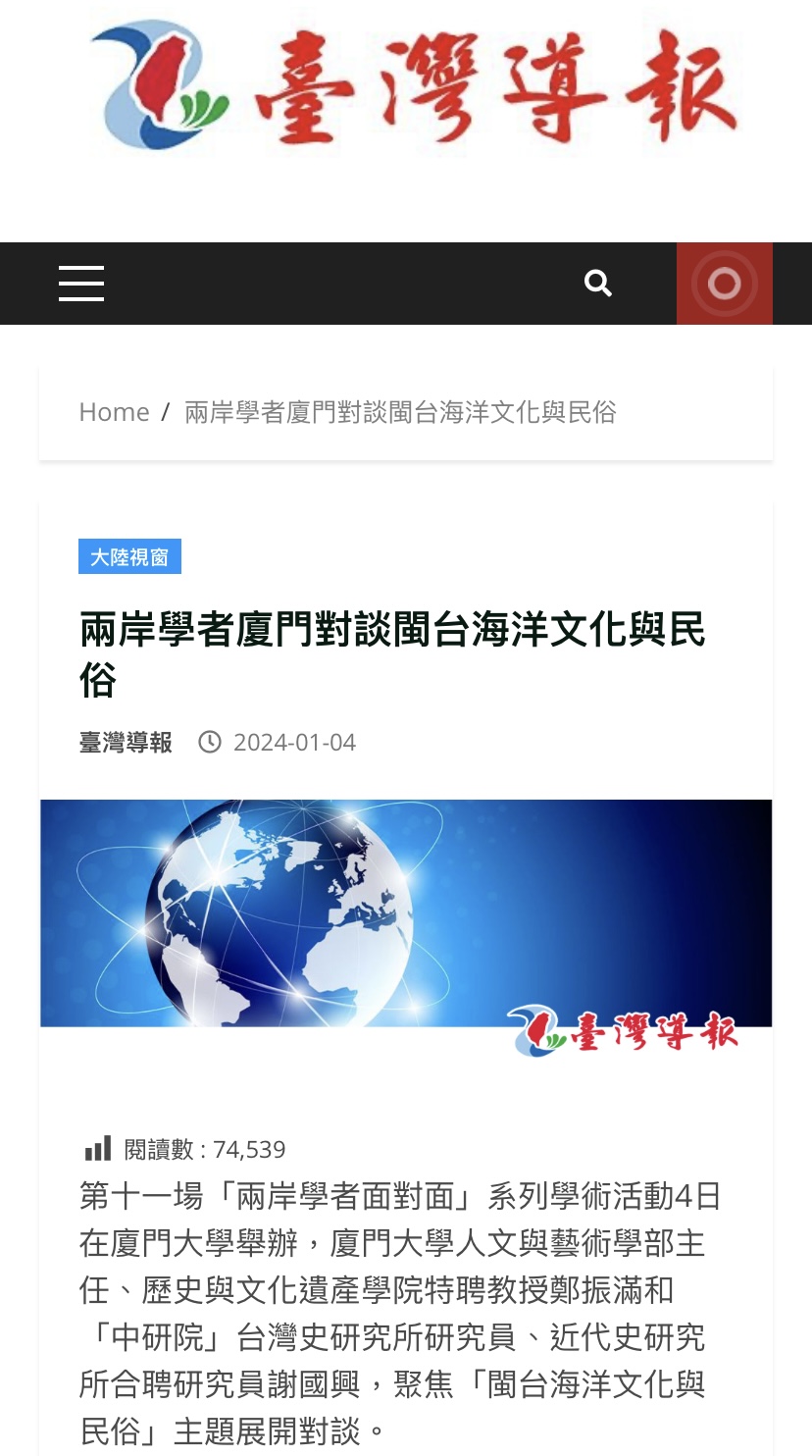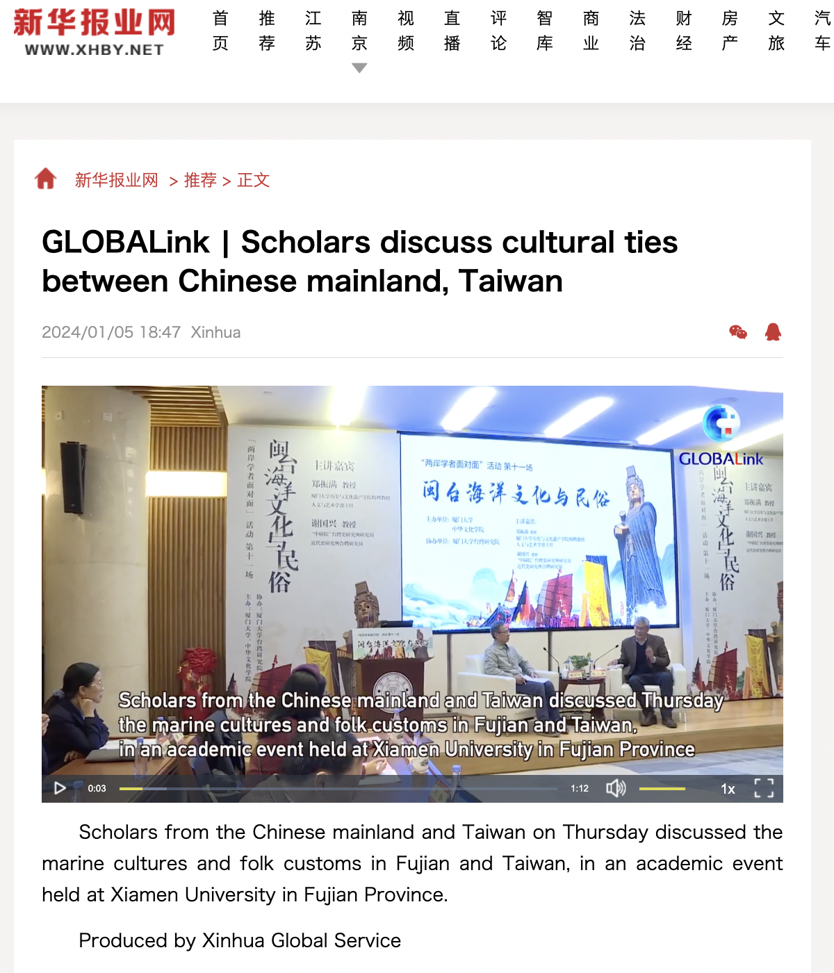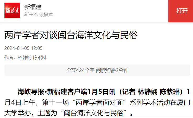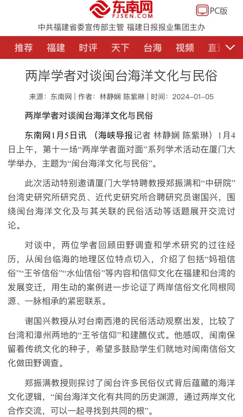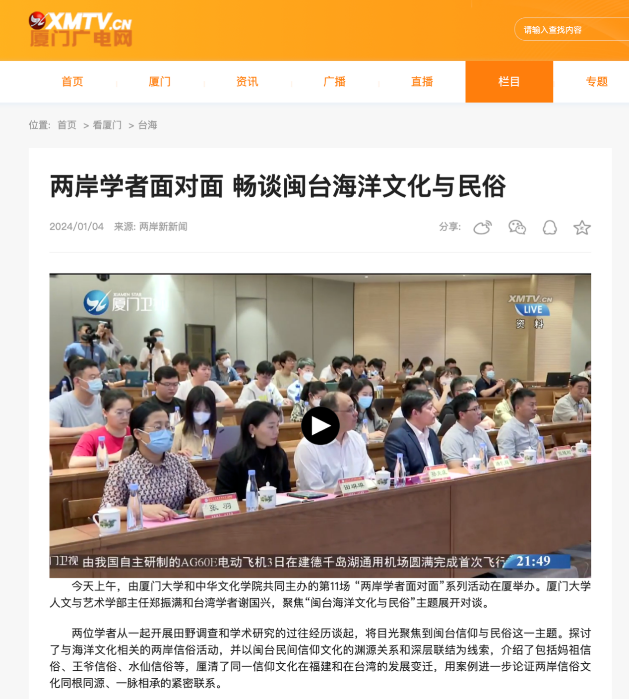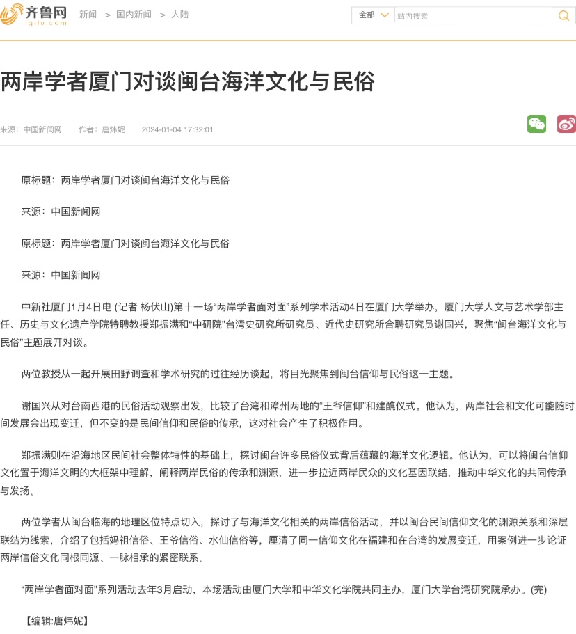 近日,由厦门大学和中华文化学院共同主办的“两岸学者面对面”系列活动第十一场在厦门大学科学艺术中心举办。厦门大学人文与艺术学部主任、历史与文化遗产学院特聘教授郑振满和“中研院”台湾史研究所研究员、近代史研究所合聘研究员谢国兴以“闽台海洋文化与民俗”为主题展开对谈。该活动引起了海内外媒体的广泛关注。